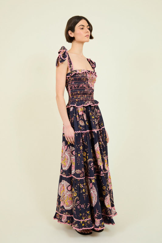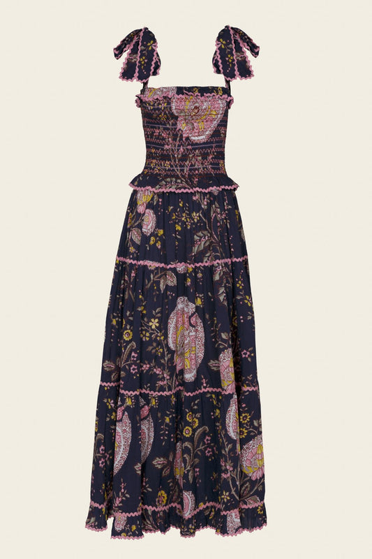 El conjunto Philippa 1970 en morado y mostaza con estampado paisley cobra vida al combinarlo con exquisitos accesorios. El bolso Bernatta de Laia Alen , confeccionado en lustroso satén de seda de la icónica firma barcelonesa Gratacós, añade un toque de sofisticación de inspiración vintage.
