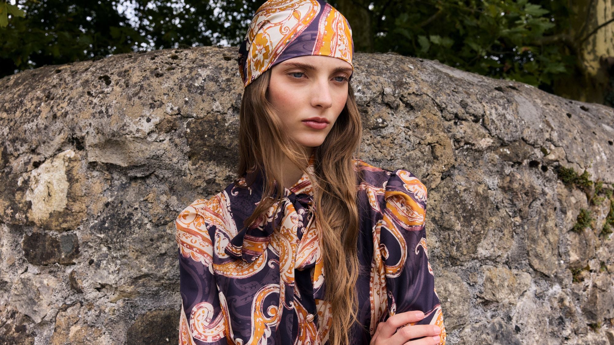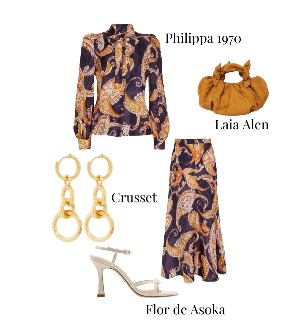 El conjunto Philippa 1970 en morado y mostaza con estampado paisley cobra vida al combinarlo con exquisitos accesorios. El bolso Bernatta de Laia Alen , confeccionado en lustroso satén de seda de la icónica firma barcelonesa Gratacós, añade un toque de sofisticación de inspiración vintage.