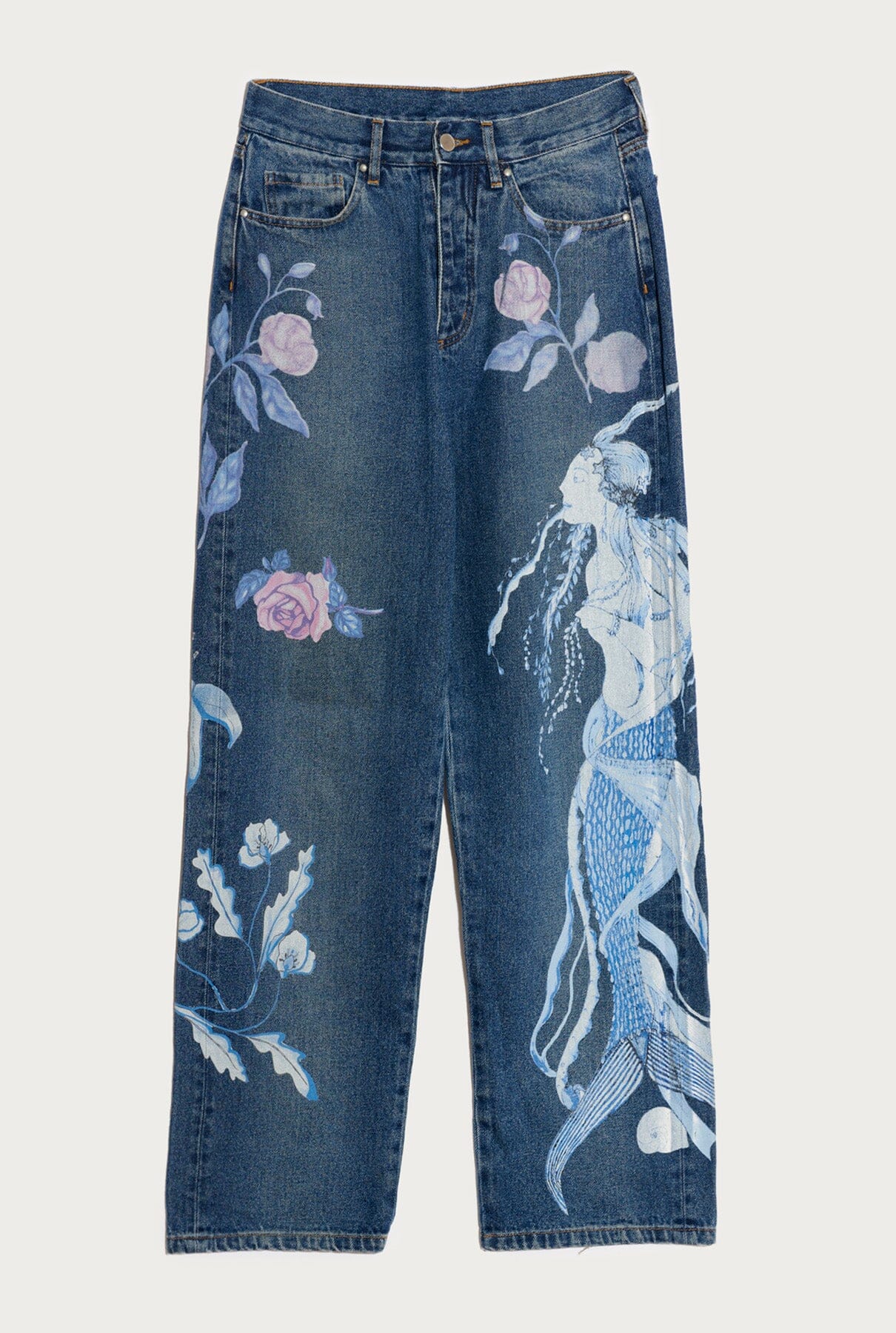 Mid-rise, large straight-leg fit. Dark blue wash. "Nereids" print designed by La Beltraneja all over the jeans. Button fly closure.
