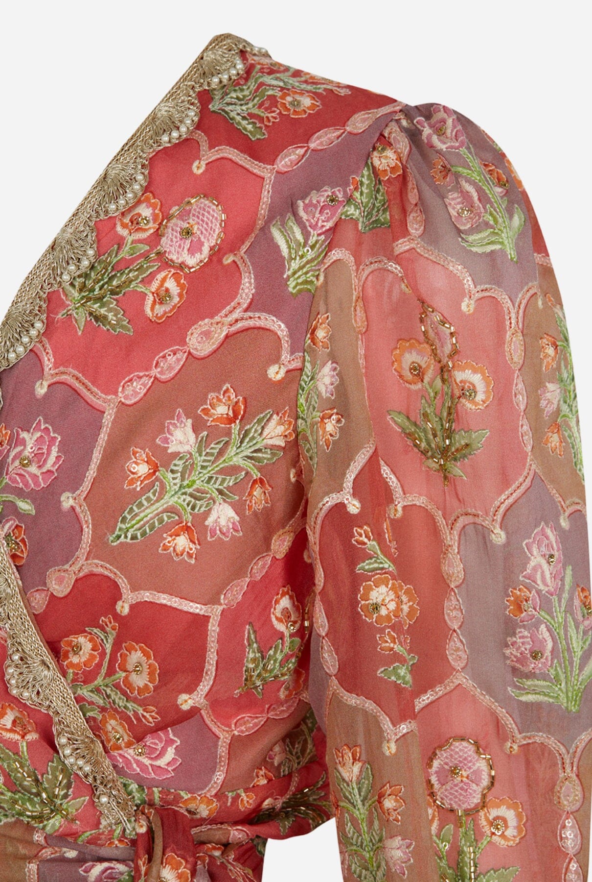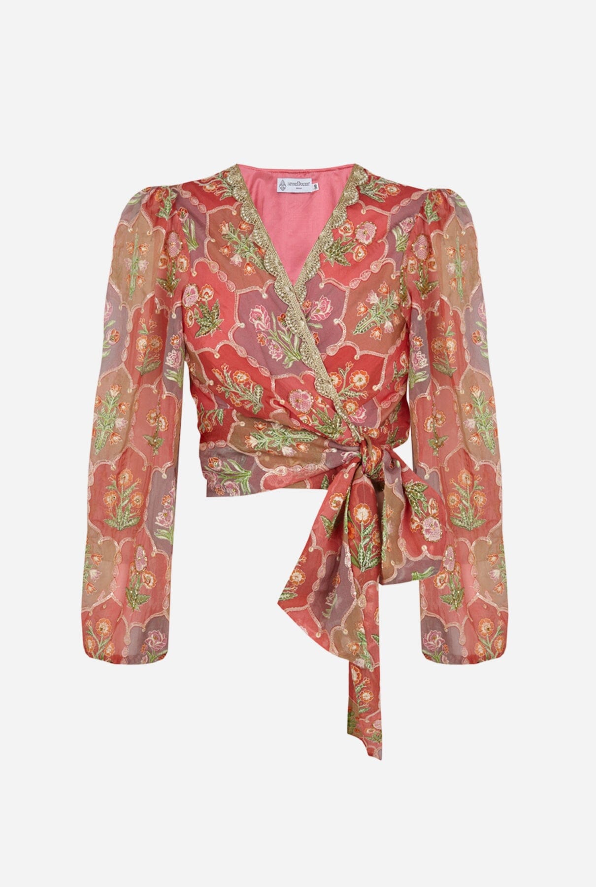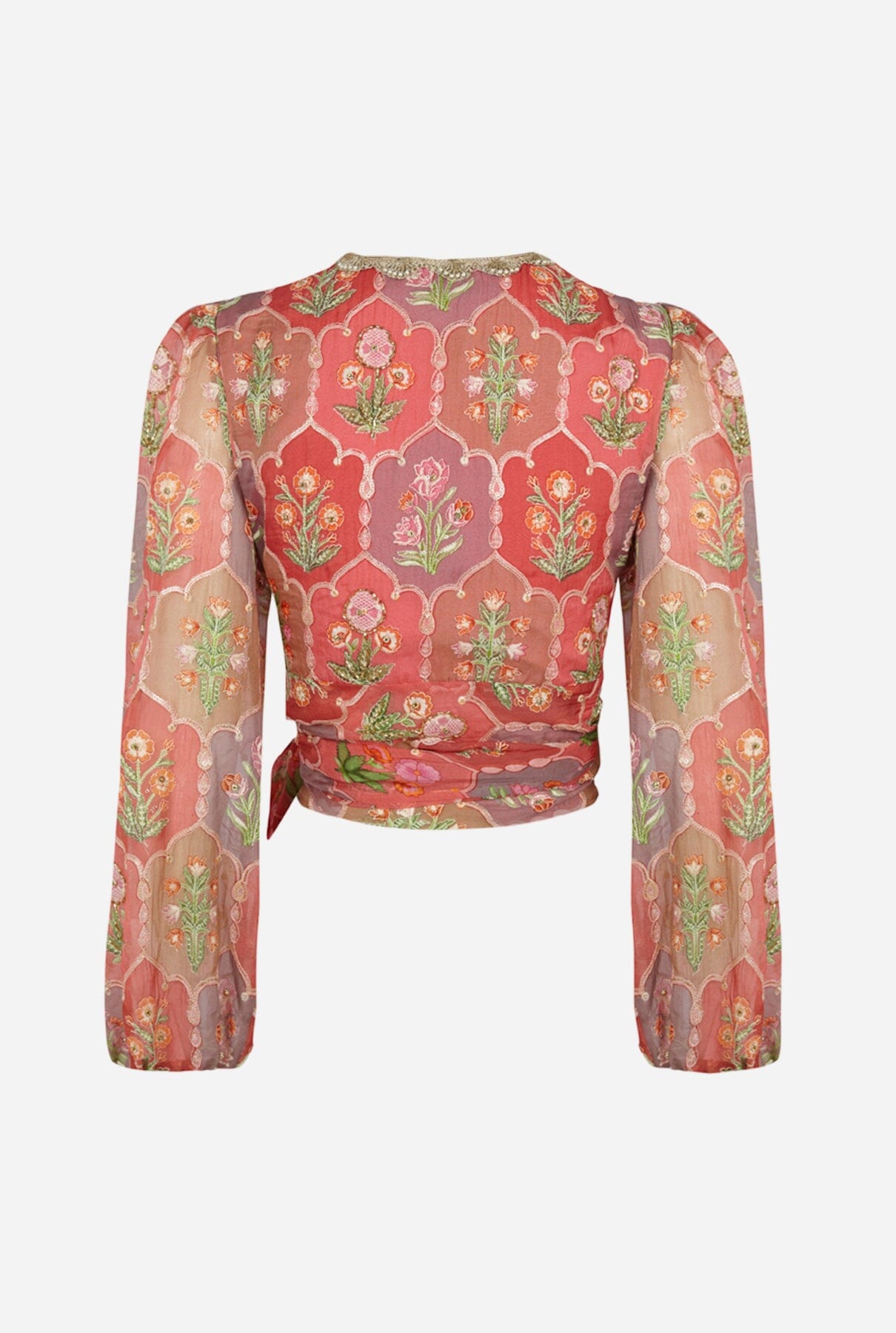 Floral-print organza wrap shirt with a V-neckline and long puffed sleeves trimmed with elastic. Front tie closure with metal trim.
