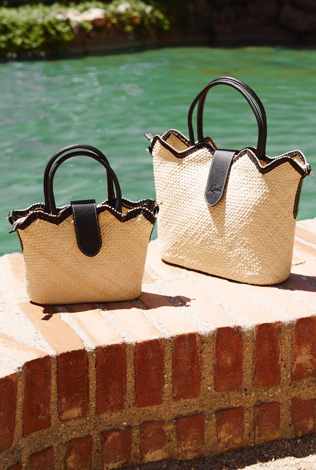 Ivory small-sized basket bag with a hand strap and an adjustable shoulder strap made of 100% cowhide leather. Woven from iraca palm, harvested, processed, and traditionally dyed by farmers and artisans from Sandona, Nariño, in the south of Colombia. The transformation process is completely ecological, using natural dyes and recycling water for the boiling and dyeing of the palm. The lid and details of the bag, such as the loops and straps in black, are made of 100% cowhide leather from Ubrique, Cádiz, Spain, and are handcrafted by local artisans. The double stitching, triple edging, and lacquered finishes ensure a long lifespan with proper care.
