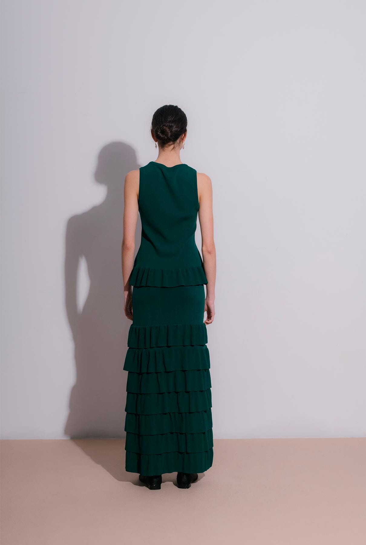 It has a flamenco-inspired  cut with tiers of  knitted ruffles that create plenty of volume. Pair it with the matching Carmen Top if you're going for a coordinated look. It can be also styled as a off shoulder dress if you are willing for a more eclectic look however the garnment has been thought as skirt.