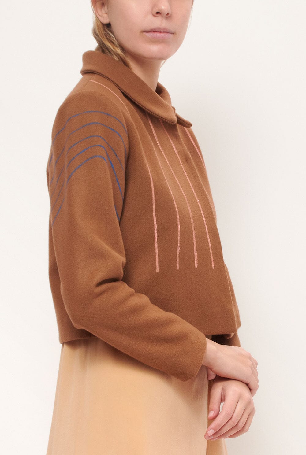Jacket with a shirt collar, hand-painted lines with textile paint. Front snap button fastening.