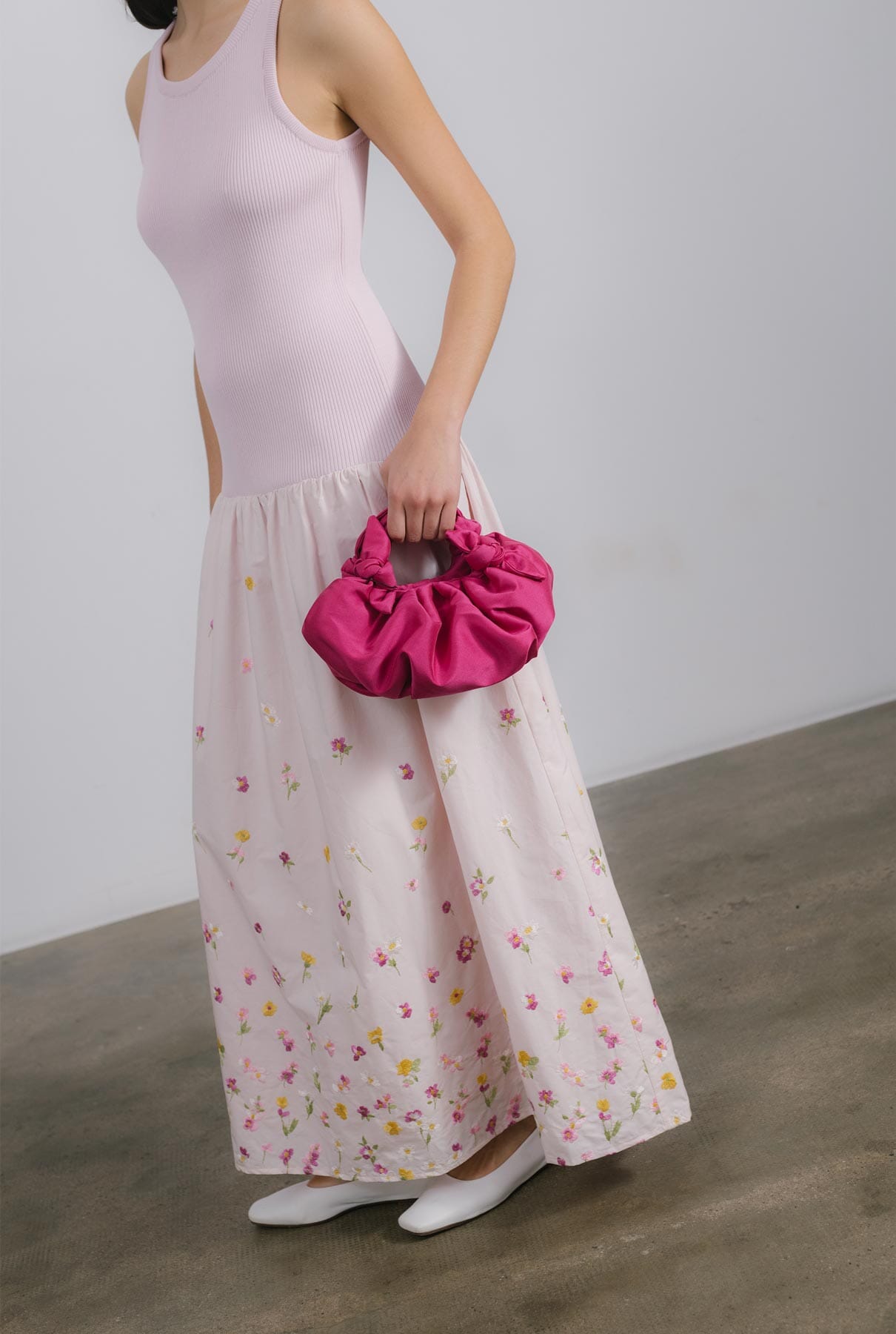 It's made ribbed sleeveless knitted top and a cotton taffeta embroidered skirt softly ruched for plenty of movement. The low-shaped waist emphasizes your body shape.