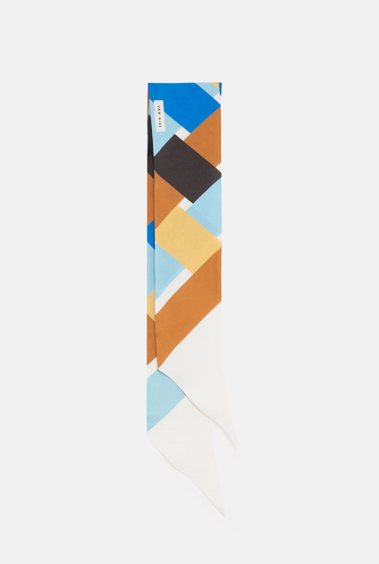 Limited Edition designed by Carrie Van Hise. Long double silk scarf printed with graphic weave design inspired in the spirit of Ibiza and the glamour of New York’s Studio 54. The Ibiza scarf can be worn around the neck, as a head scarf, or to belt a dress or jeans for a casual look.