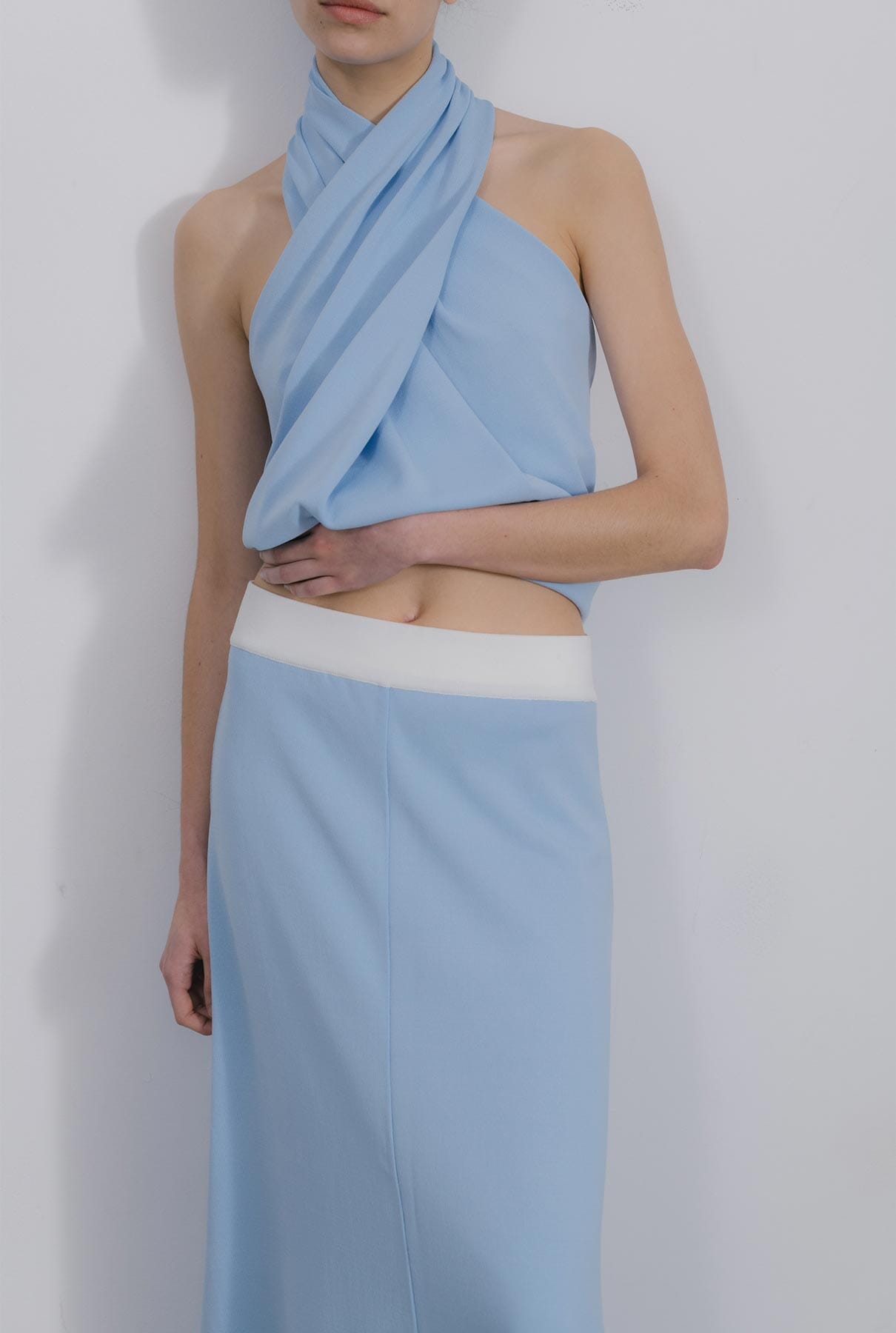 This flared skirt is crafted from a viscose blend knitted fabric. It has an eye-catching structure that sits high on the waist and features an contrasted elasticated band for a perfect fit.