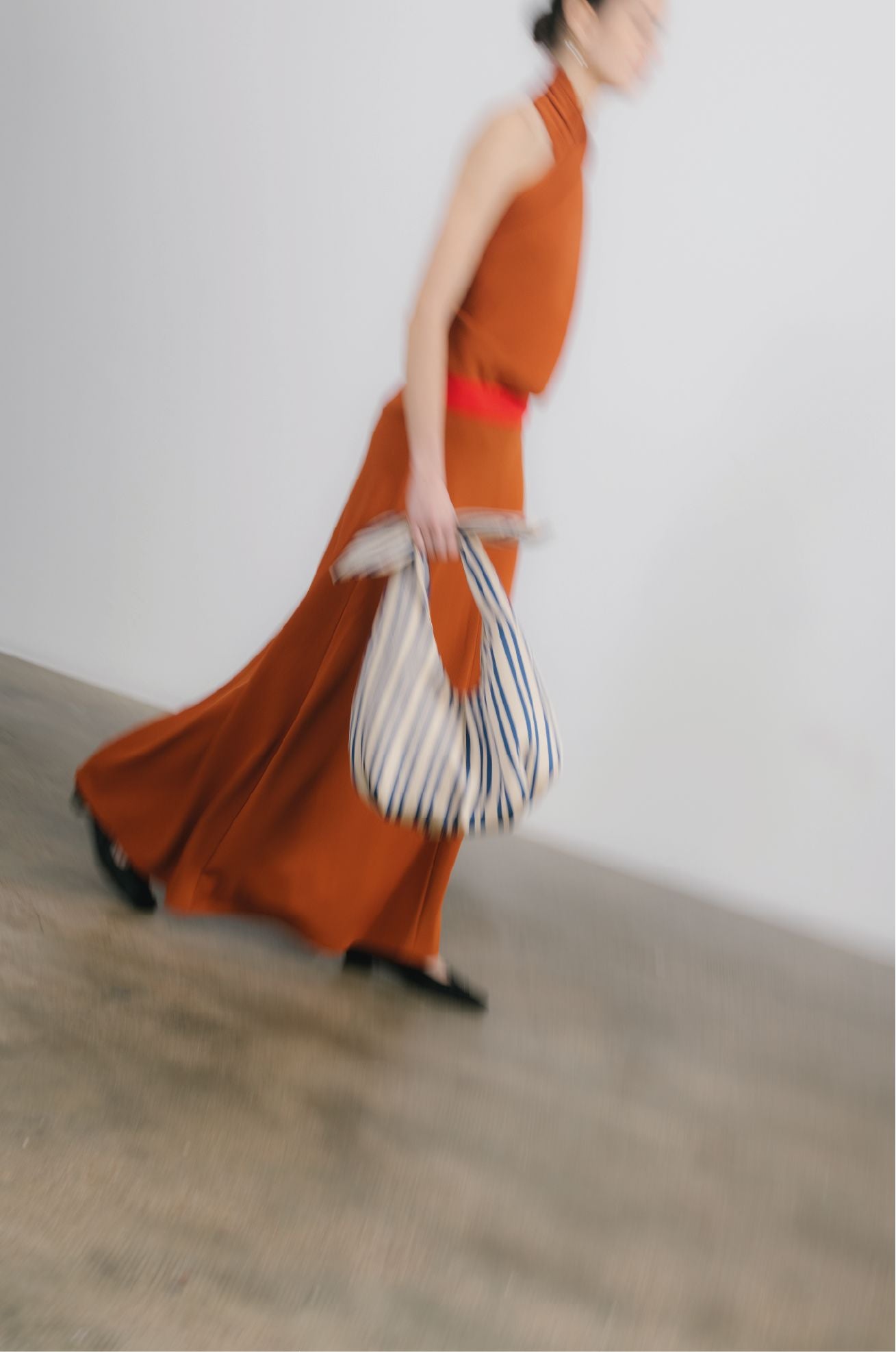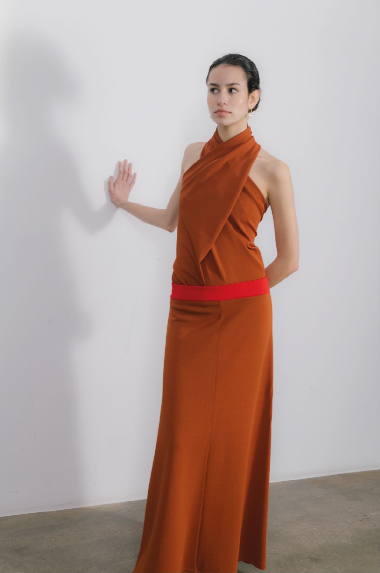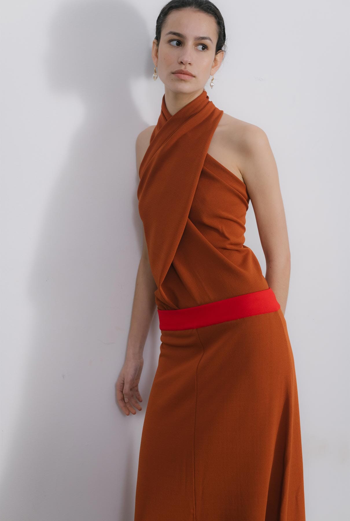 The Isa Top is a stop-and-stare piece. It is made from viscose blend breathable fabric knitted in house. This unique piece has a eye catching halterneck structure and open back. The final detail is a three pearl button closure.