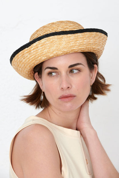 Hat inspired by the classic sailor hat. Made of natural wheat straw with a black brim, it is the perfect accessory to add a touch of style to your look.