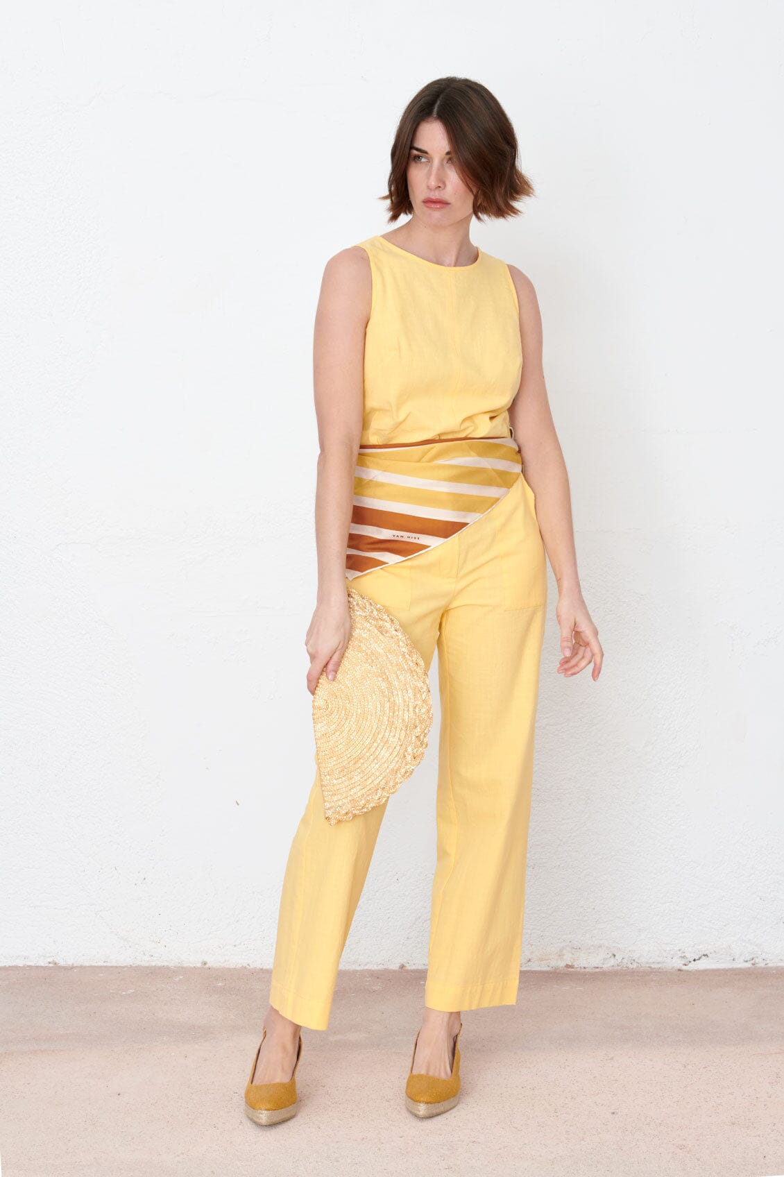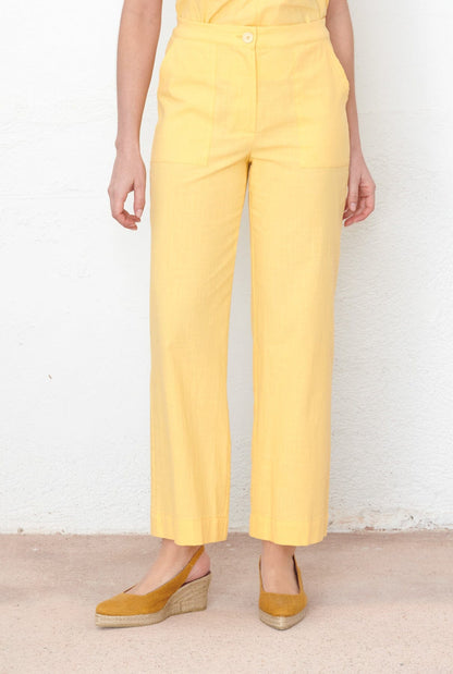 Straight pants with waistband and adjustable inner drawstring. Two front and two back pockets. High waist. Cotton fabric, ideal for the summer months.