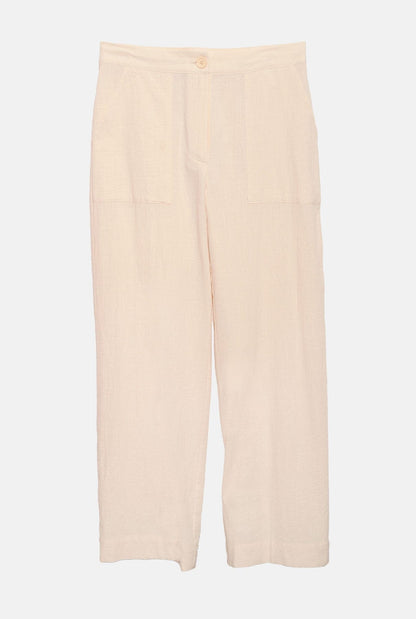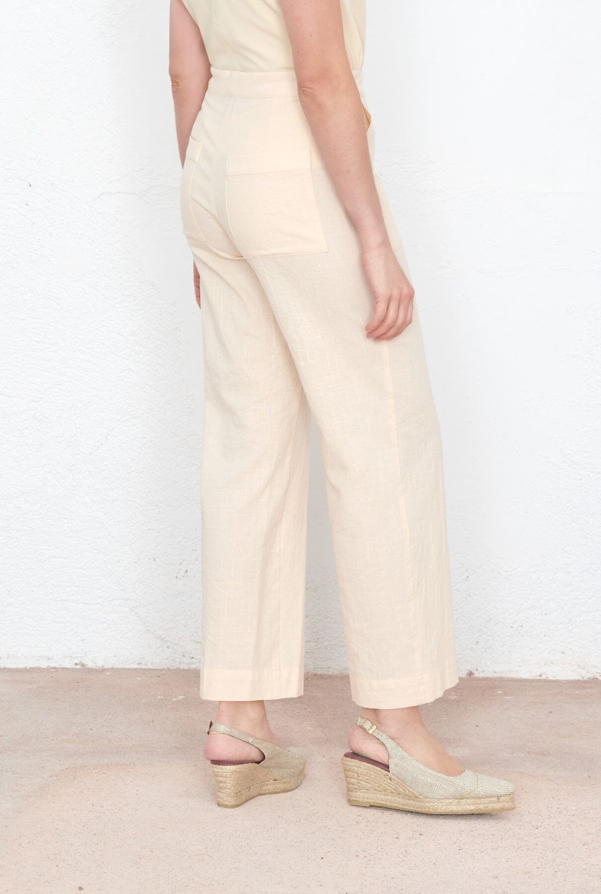 Straight pants with waistband and adjustable inner drawstring. Two front and two back pockets. High waist. Cotton fabric, ideal for the summer months.