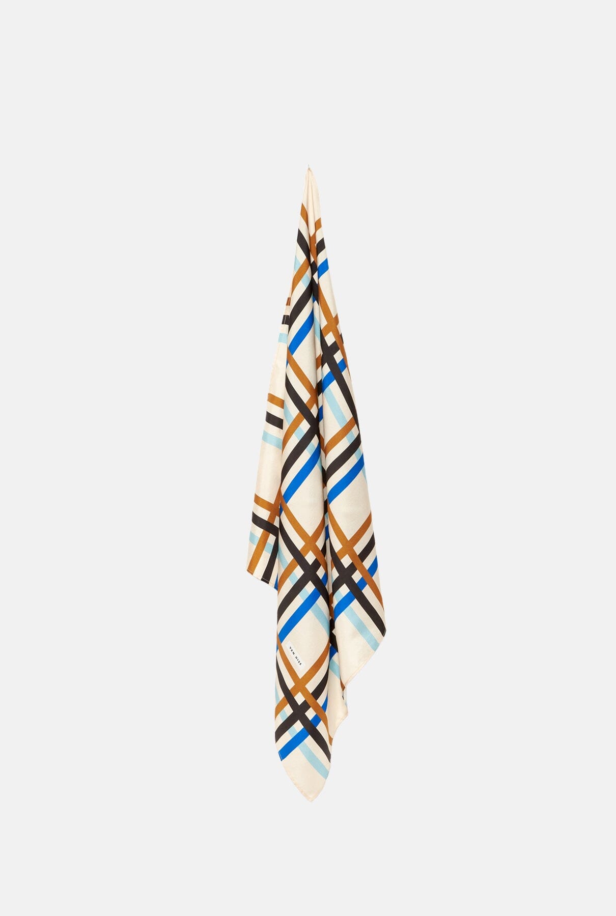 Limited Edition designed by Carrie Van Hise. Square scarf with plaid print design inspired by the Costa Brava. The Pili scarf can be worn around the neck, as a head scarf, or around the hip. Made in Spain.