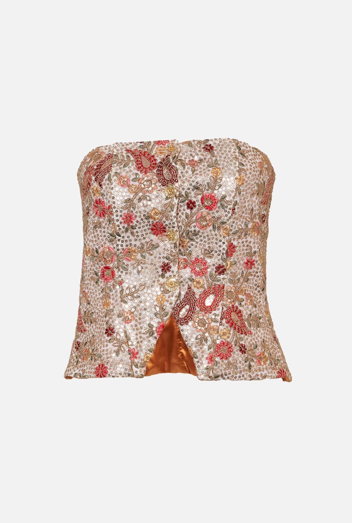 This design by L.D. It is made of a jewel fabric embroidered in flowers with gold thread. Off-shoulder model and front closure with jewel buttons. Lined.