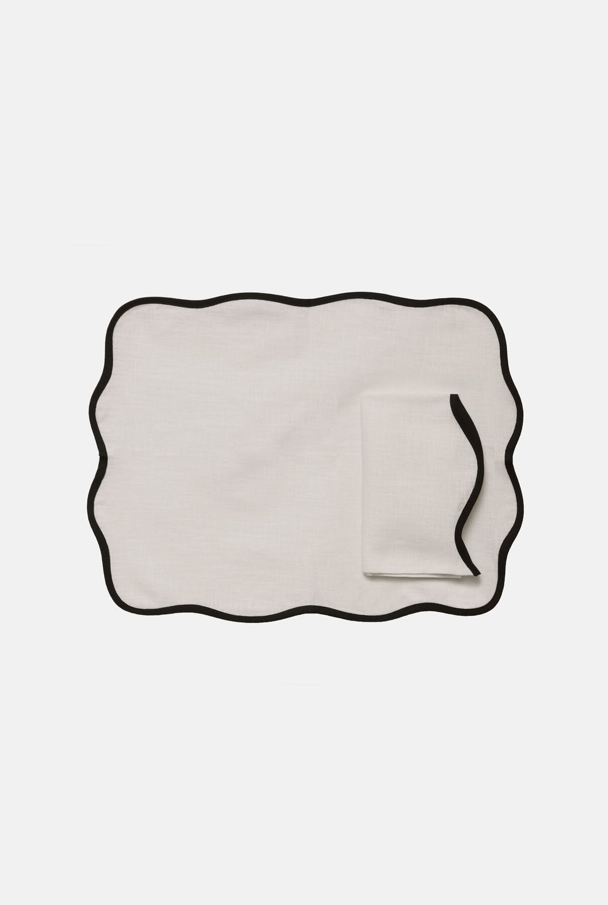 Set for 2 persons including ; 2 grey linen placemats with black curvy + 2 napkins 45x45 cm black linen with white curvy.