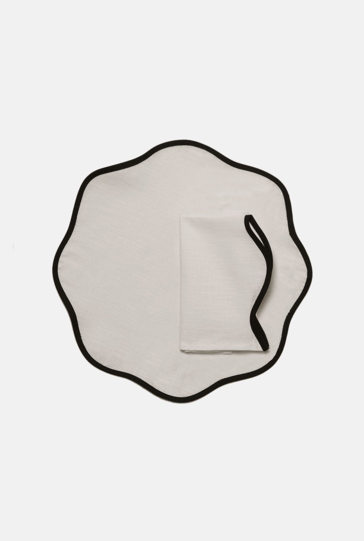 Set for 2 persons including ; 2 grey linen placemats with black curvy + 2 napkins 45x45 cm black linen with white curvy.