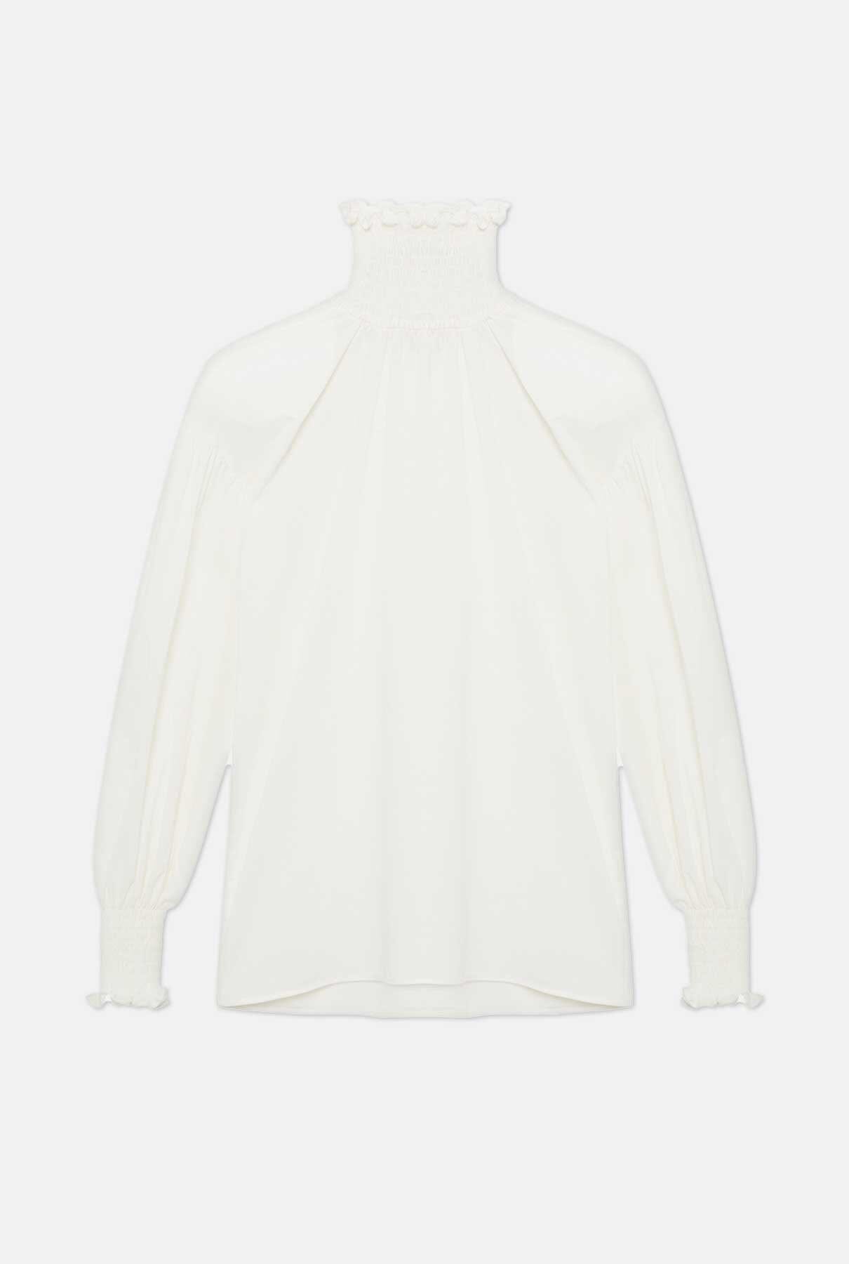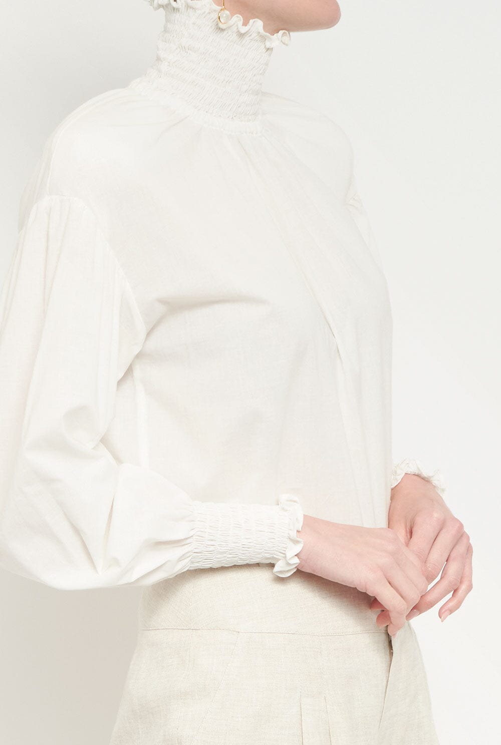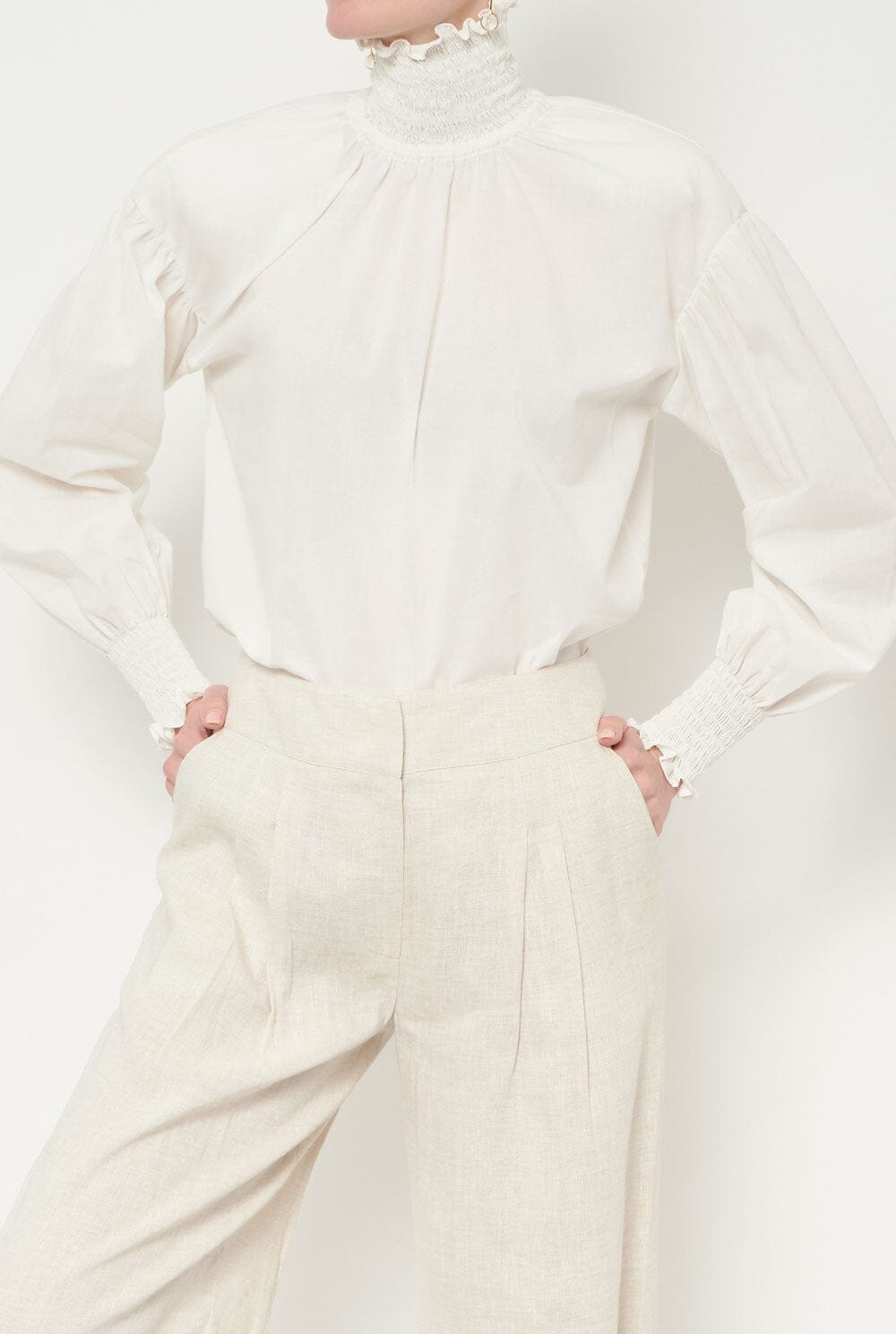 Long-sleeved shirt in ecru, with high collar and cuffs with elastic gathering. Made from 100% organic cotton. Designed by Julise Magon.