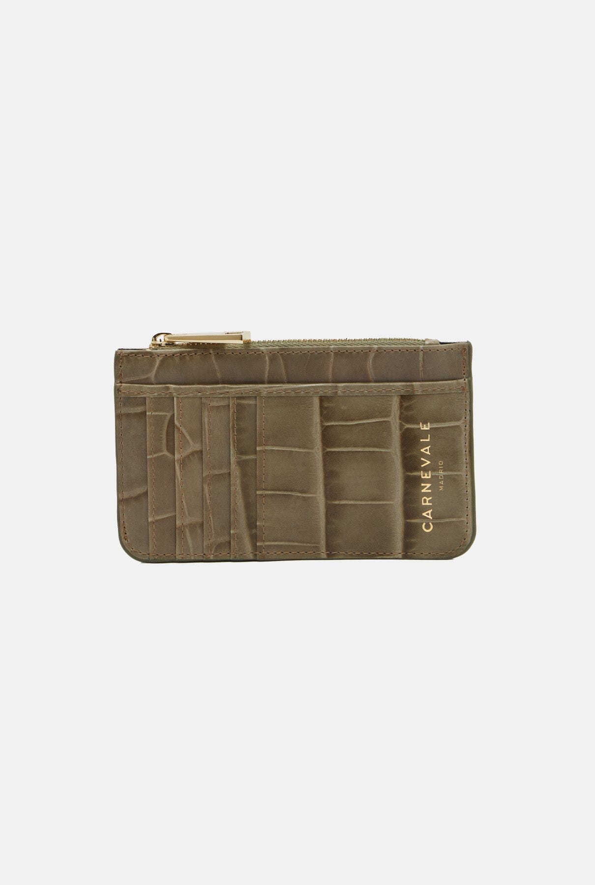 Our Luisa card holder in taupe, made of leather with a coconut embossed effect. It has 5 compartments on one side to accommodate different cards, a larger central compartment and a coin compartment covered by a gold-coloured zip. On the front of the card holder you will find the Carnevale Madrid logo engraved in gold.