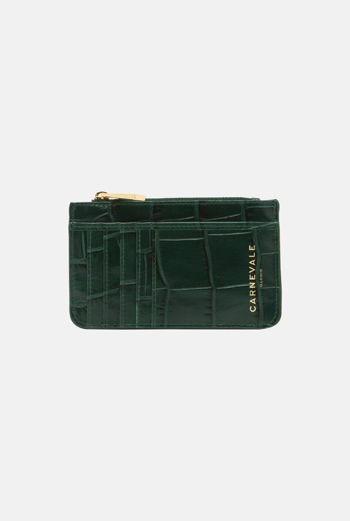 Our Luisa card holder in emerald green, made of leather with coconut embossed effect. It has 5 compartments on one side to accommodate different cards, a larger central compartment and a coin pocket covered by a gold-coloured zip. On the front of the card holder you will find the Carnevale Madrid logo engraved in gold.