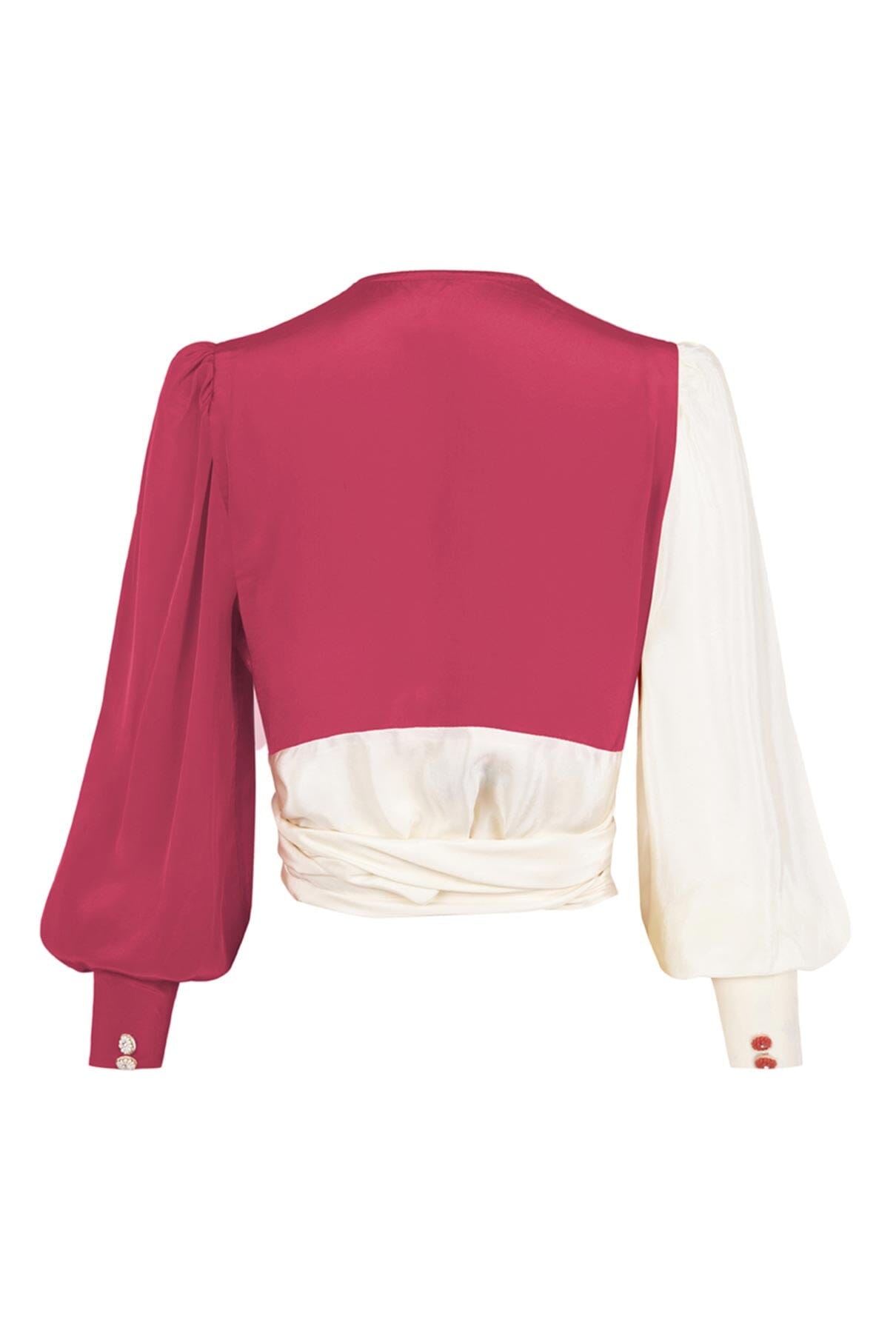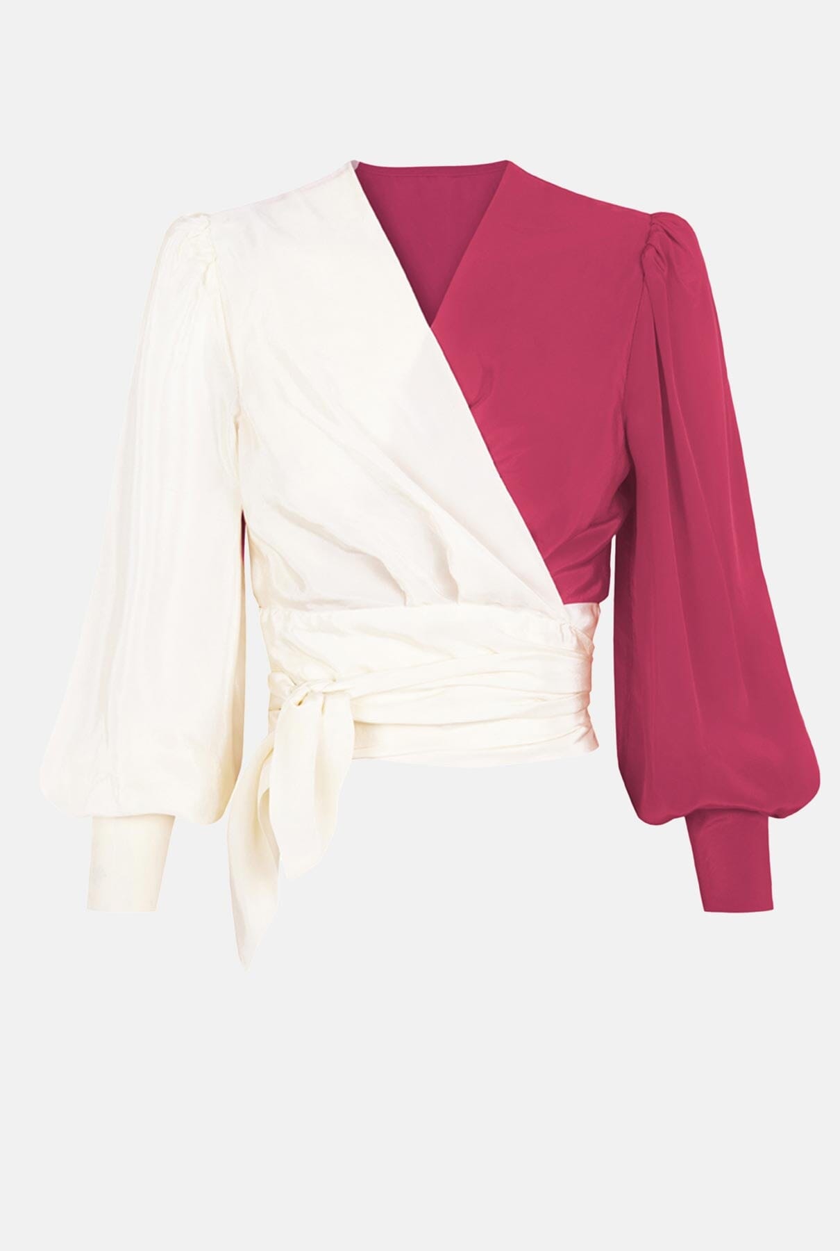 Wrap shirt with a V-neckline and long cuffed sleeves. Made from a blended fabric. Front tie closure.