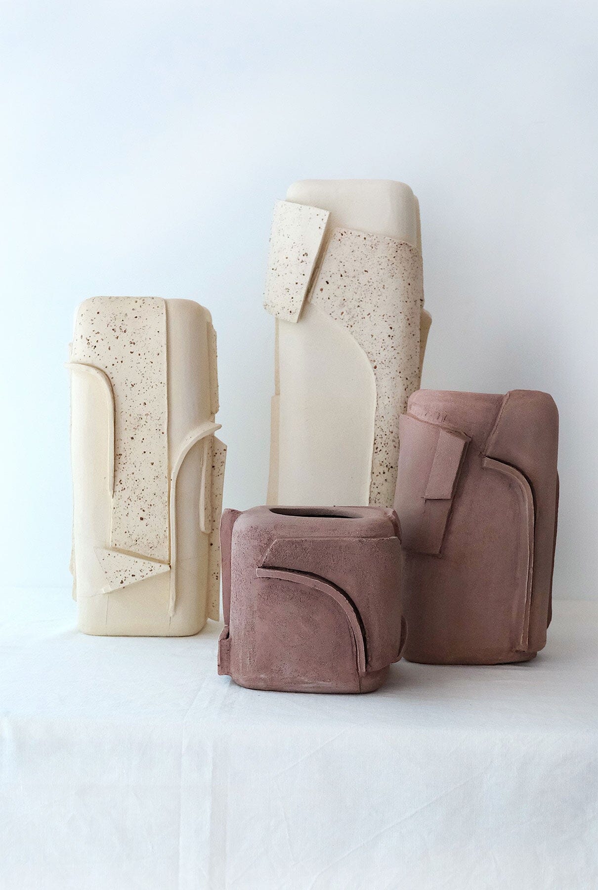 Pieces made of natural stoneware and inlaid aggregates, based on overlapping plates and geometries. Framed in natural oak wood.