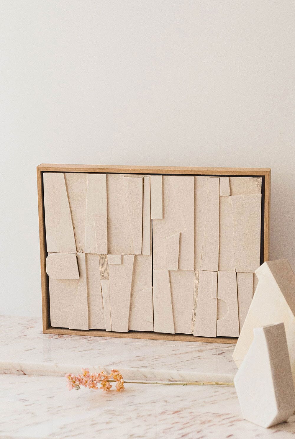Ceramic mural made of natural stoneware, based on overlapping plates and geometries. Framed in natural oak wood.