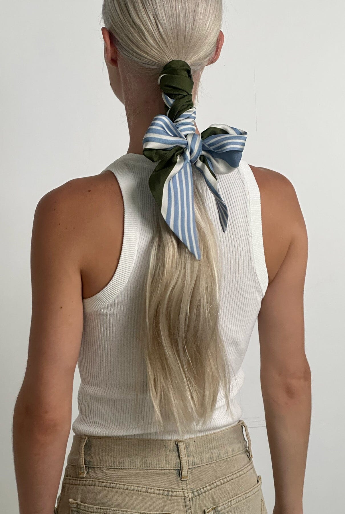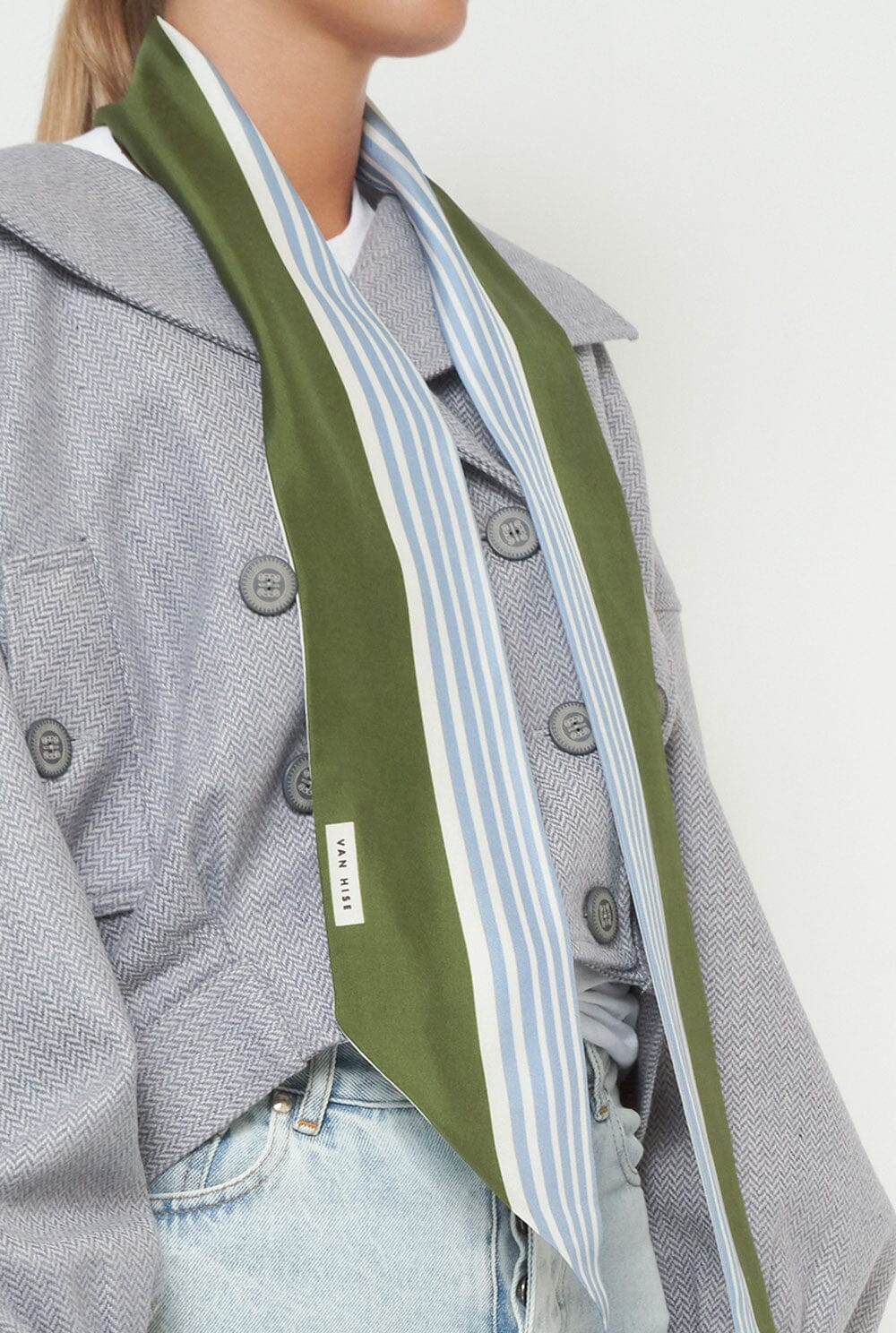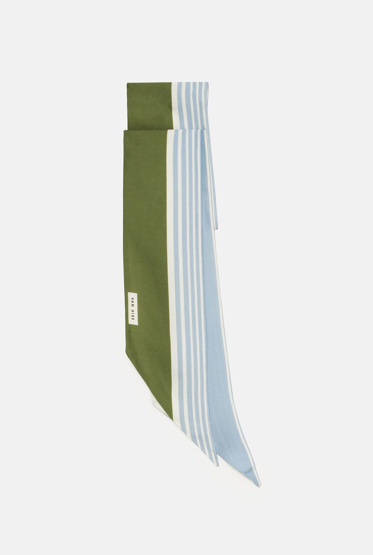Limited Edition designed by Carrie Van Hise. Long double silk scarf printed with original color block design. The Vero Stripe scarf can be worn around the neck, as a head scarf, or to belt a dress or jeans for a casual look.