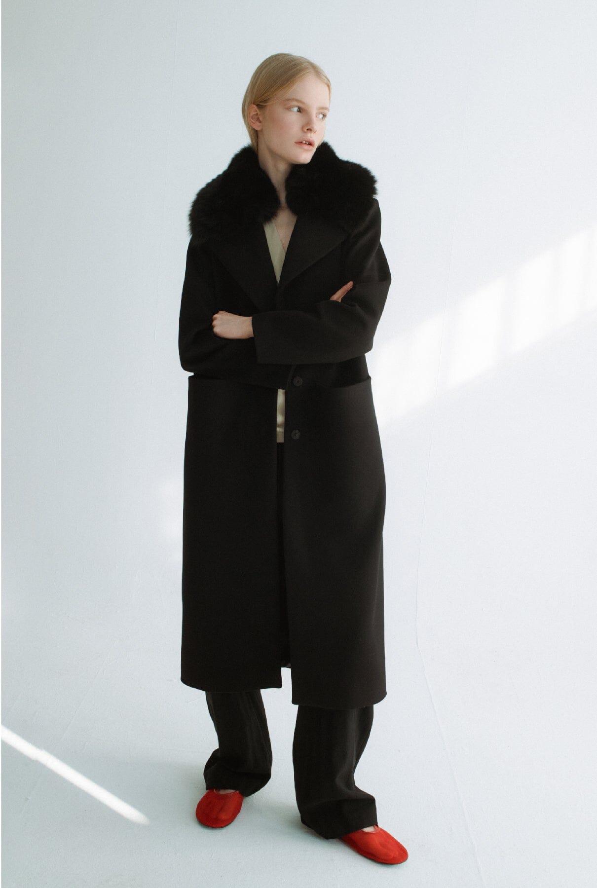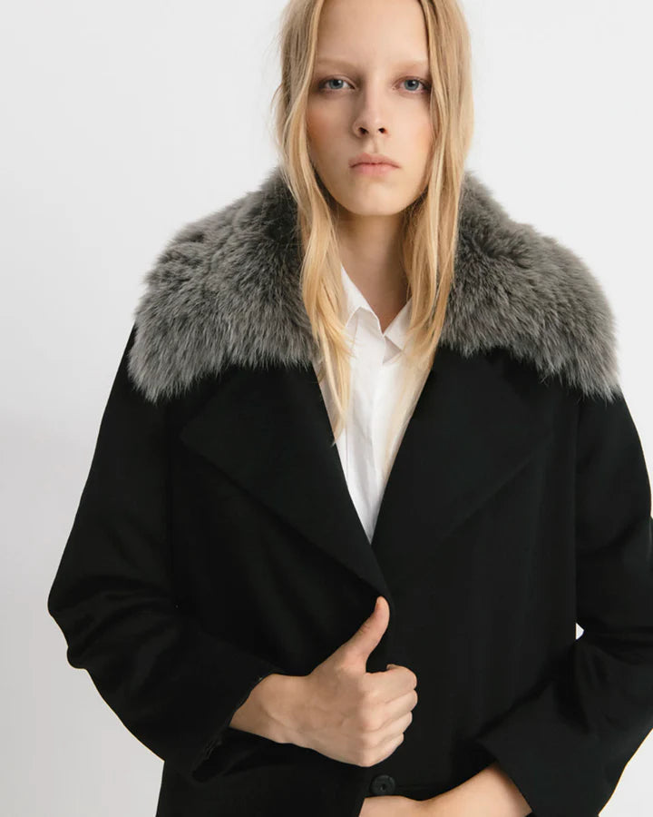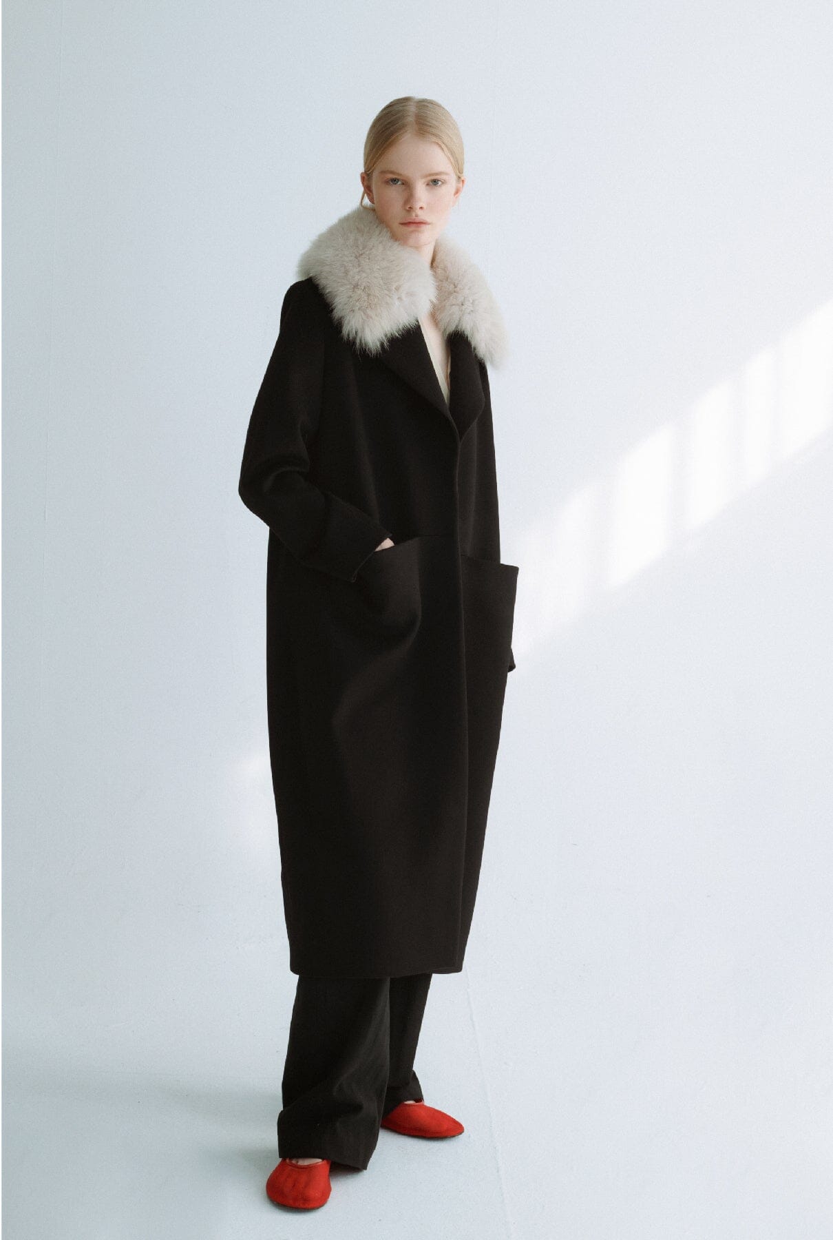 Miguel Marinero's long, wrap-around coat in brown merino wool with detachable fur detail on the collar. One of the iconic coats of the firm in black and fur collar in the colour of the season, warm and enveloping, neutral and very combinable with any garment of the wardrobe. The fur collar is removable with buttons, you can remove it or change it for a different colour. Fastens with press studs.