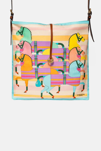 Inspired by the luxurious silk-lined interiors of Berlina covered carriages, this design transforms authentic equestrian paintings with ornate motifs into an exquisite crossbody bag.