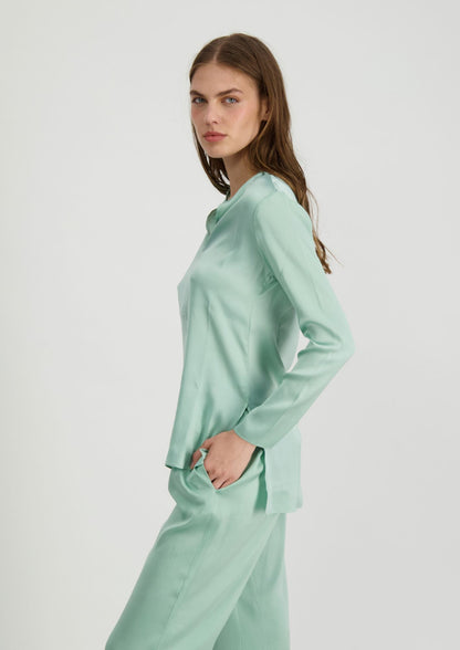 This flowing silk blouse is all you need for a relaxed yet stylish look. Its long sleeves and open neckline give it an elegant touch. The front seam that simulates a buttoned wallet gives it a minimalist and modern feel. The light drape and soft feel of the silk make it super comfortable, whether for a casual look with jeans or something more dressed up like our Pants Silk or Skirt Silk, this shirt adapts to any occasion. Its satin finish gives it a touch of subtle sheen, elevating any outfit with ease - a functional and chic garment!