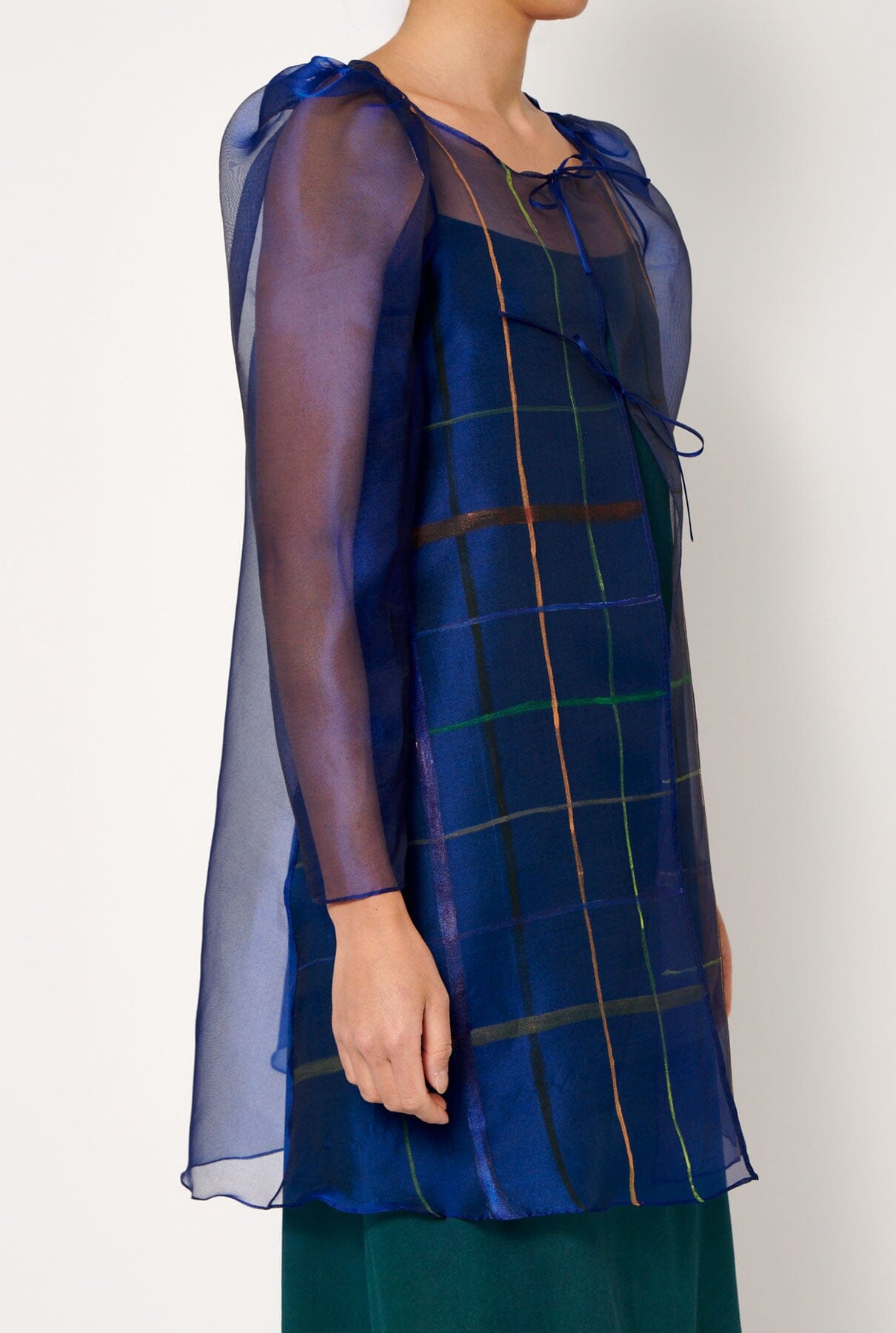 Blue silk organza blouse with colored lines hand painted with textile paint. Long puffed sleeves. Closure with strips made of the same fabric.
