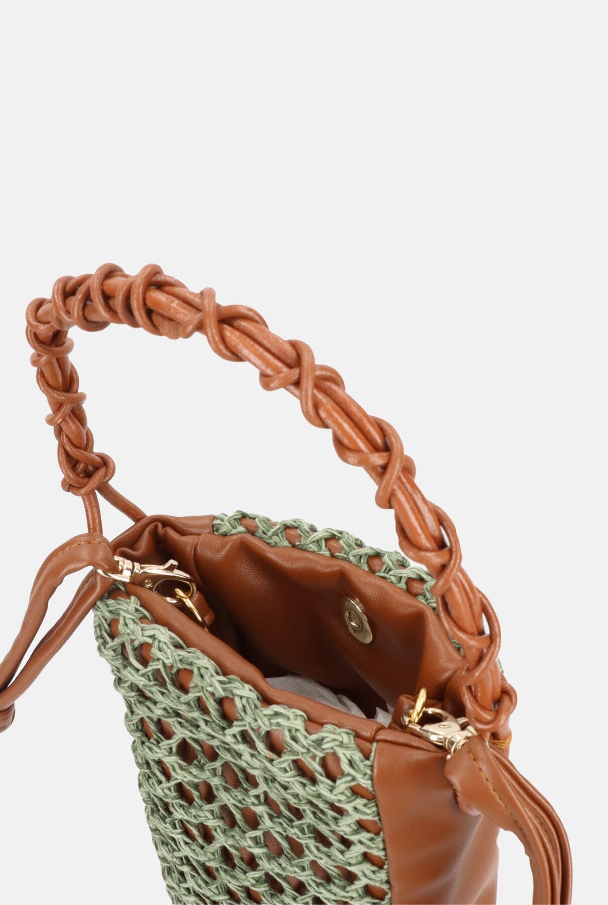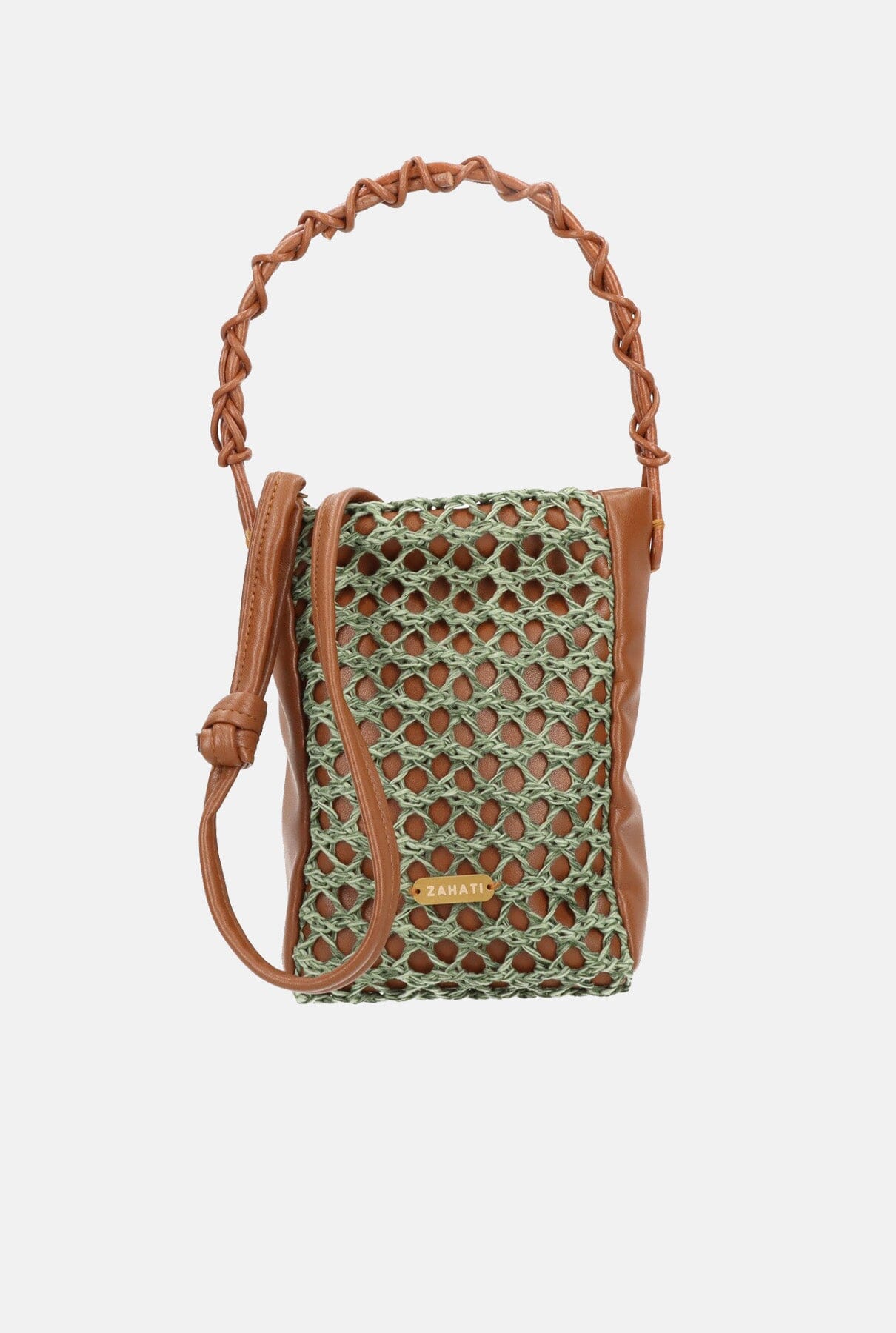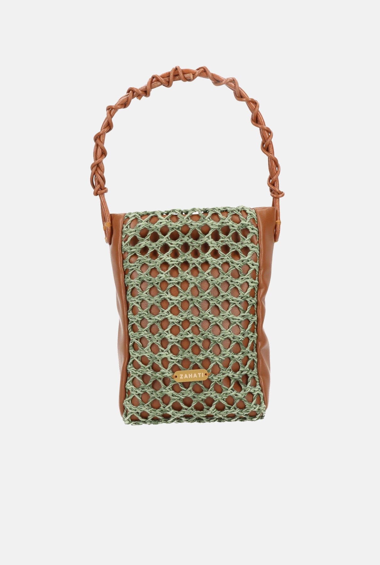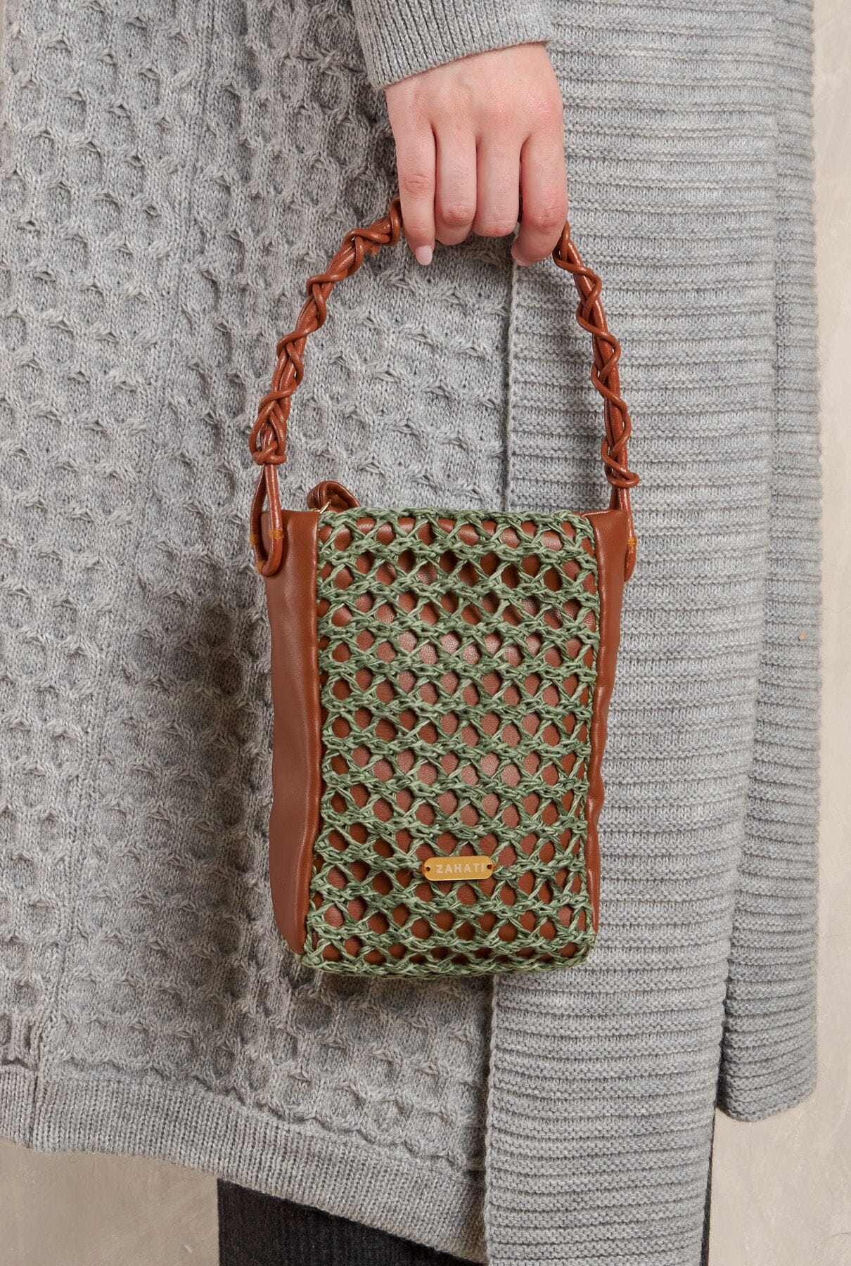 The Mini zig-zag bag is ideal for everyday use. Practical and versatile, it will give that original touch to your autumn winter look. It is made of brown vegan leather and covered with a green natural fibre net. The handle is hand braided with leather. Includes an adjustable vegan leather cord.