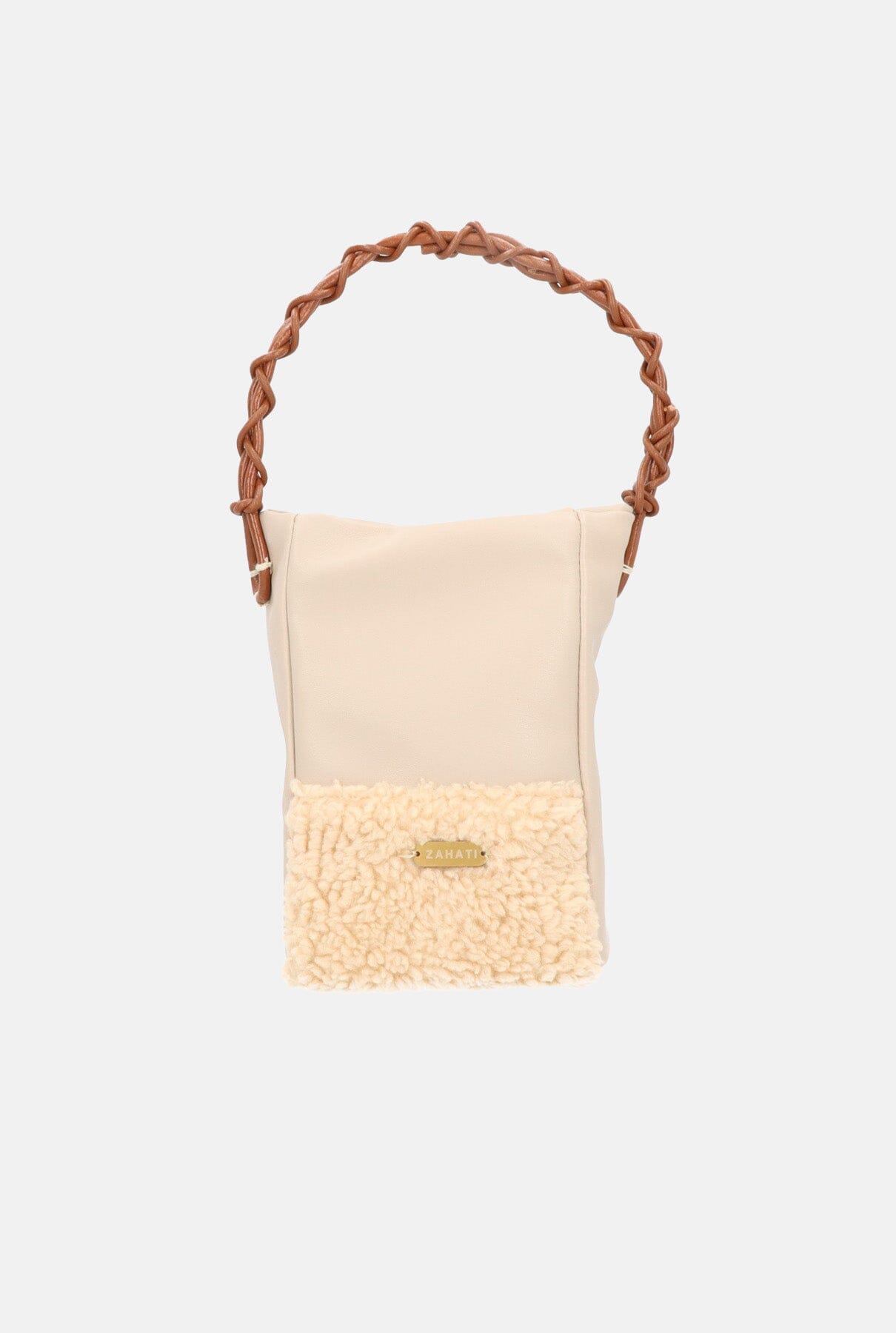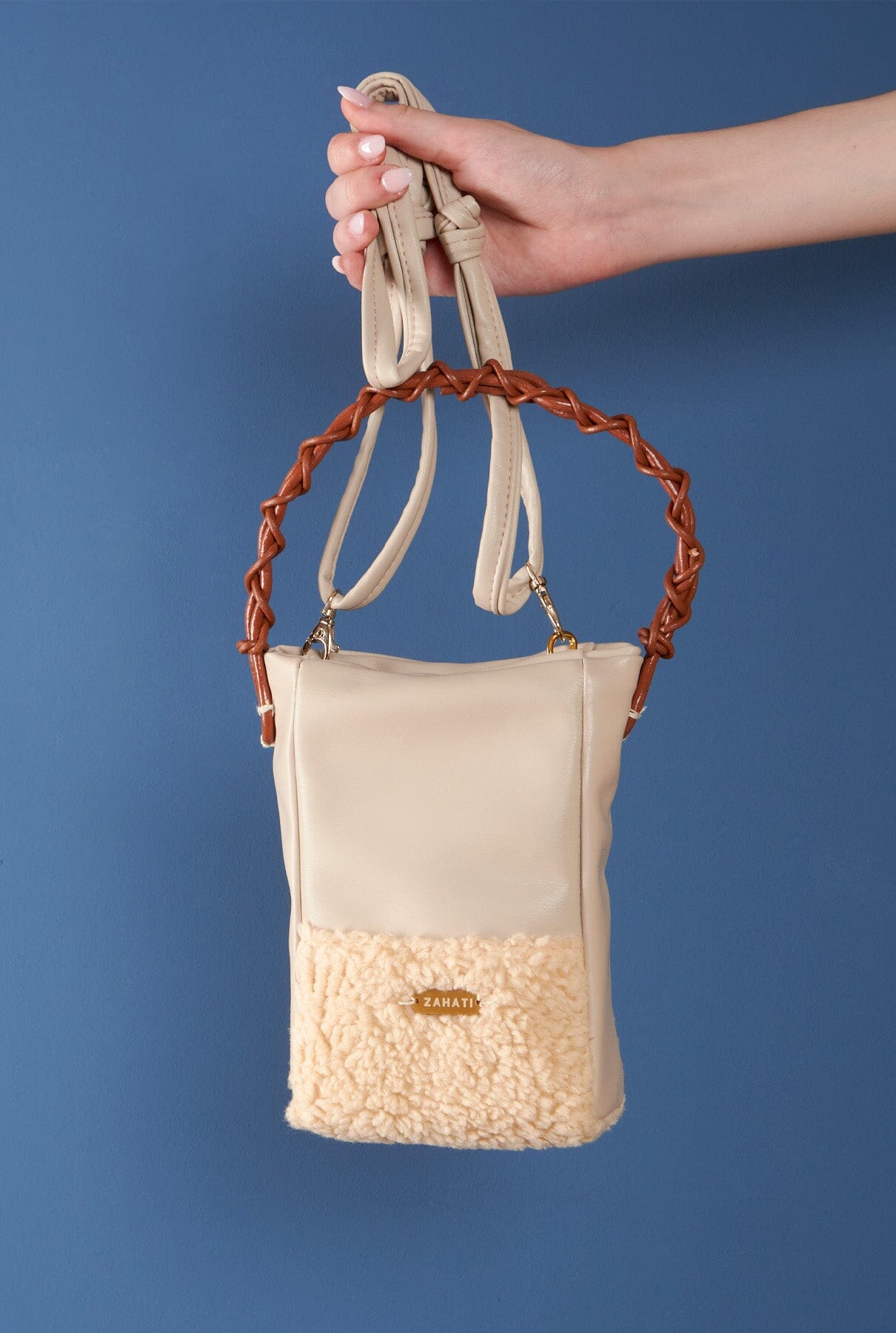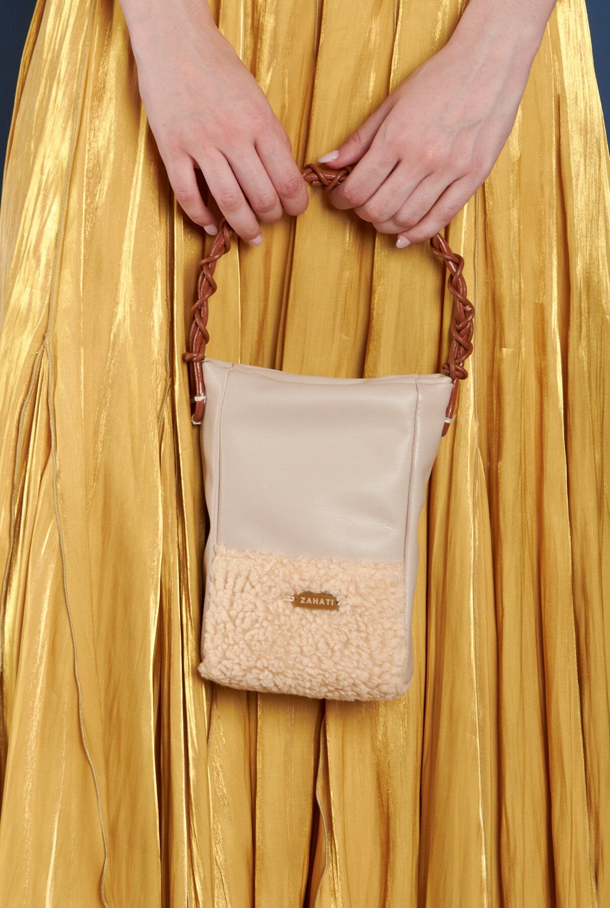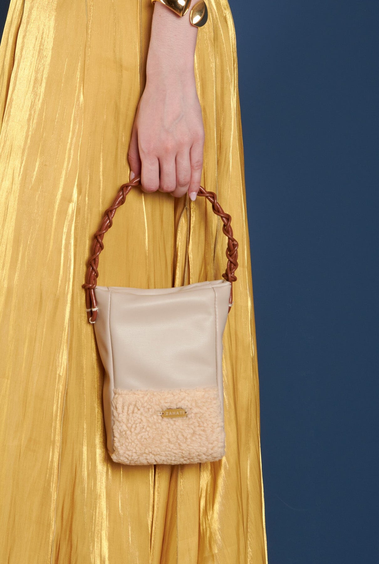 The Mini zig-zag bag is ideal for everyday use. Practical and versatile, it will give that original touch to your autumn winter look. It is created with champagne vegan leather and covered with beige natural sheepskin. The handle is hand braided with leather. Includes an adjustable vegan leather cord.