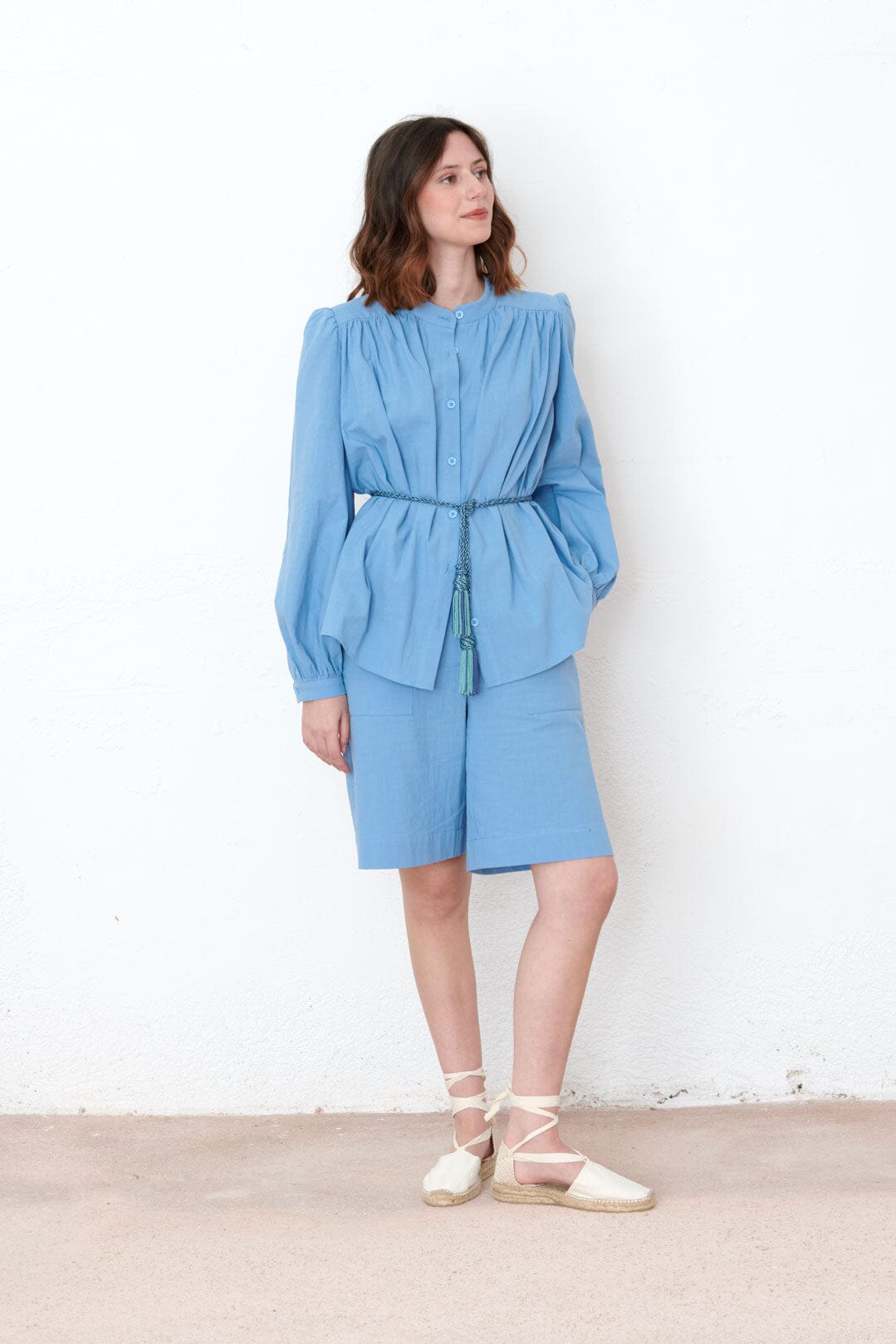 Wide long-sleeved shirt with buttoned wrist cuffs. Wide flat collar. Central opening with 7 buttons. Loose and fresh design, ideal for the summer months.
