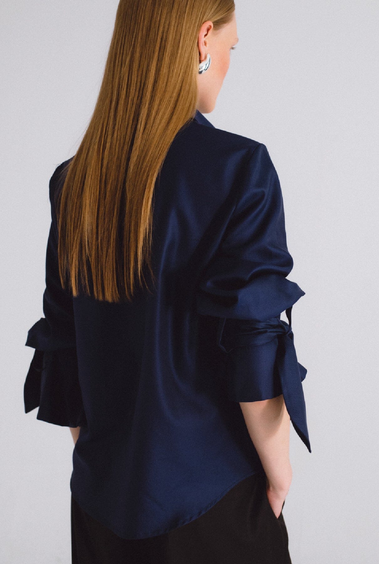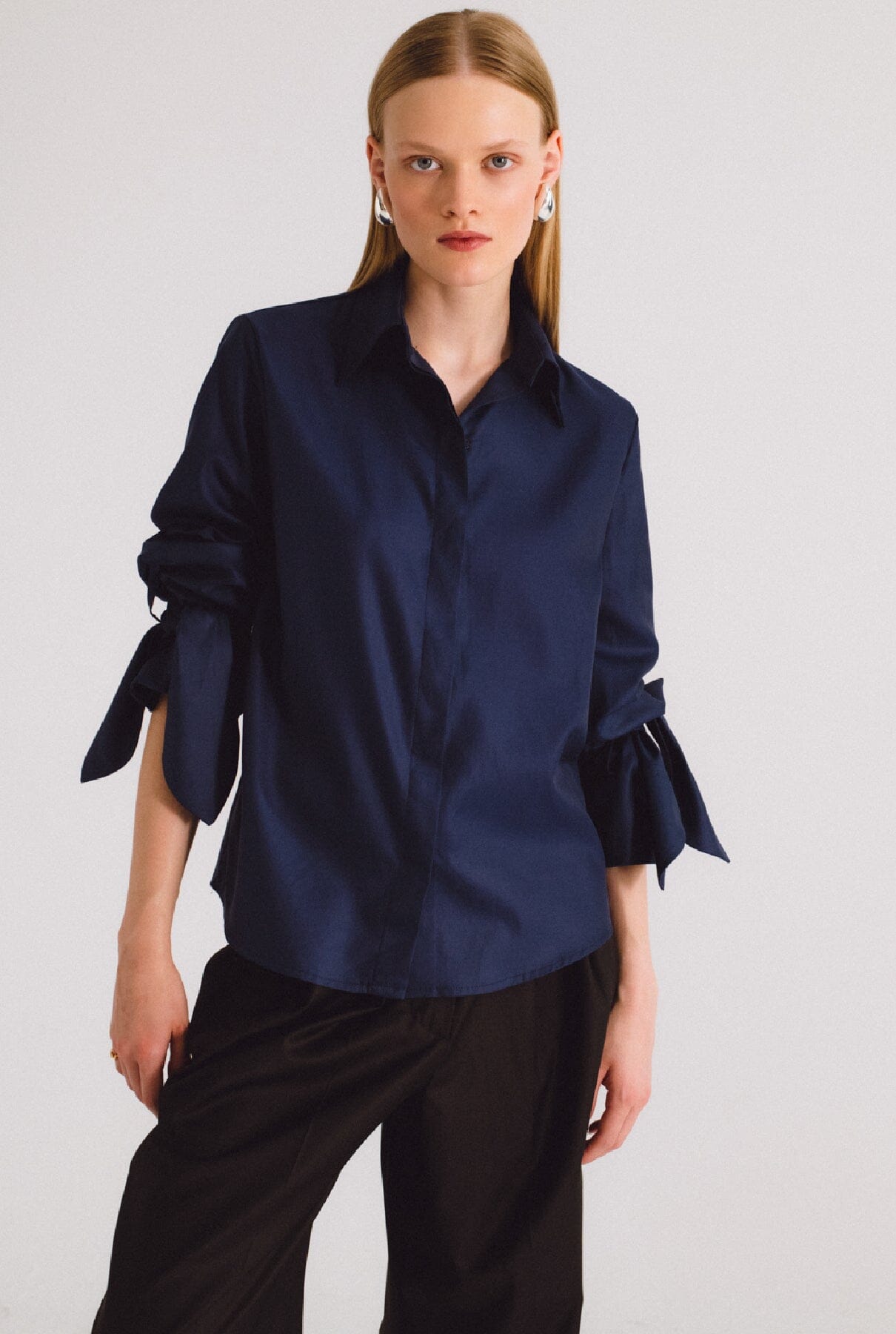 Miguel Marinero signature shirt in blue herringbone cotton. Complete your wardrobe with this wardrobe staple shirt, a versatile option for elegant meetings or a more casual look. The details on the sleeves make it special and unique, providing a sophisticated look, they have a loop on the cuffs to adjust to the desired size. Easy to tuck into high-waisted trousers or jeans because of the lightweight hem.