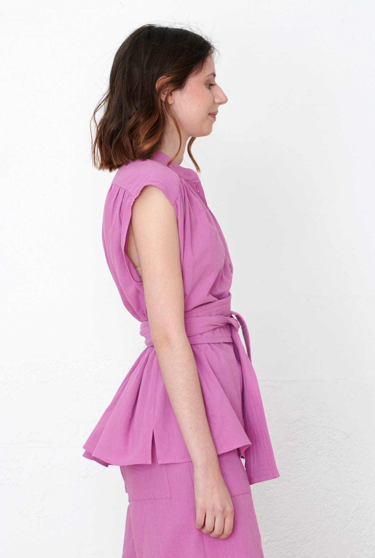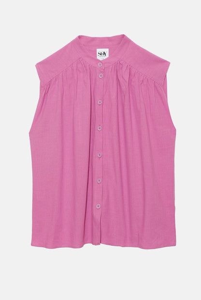 Sleeveless shirt with wide flat collar. Central opening with 7 buttons. Loose and fresh design, ideal for the summer months