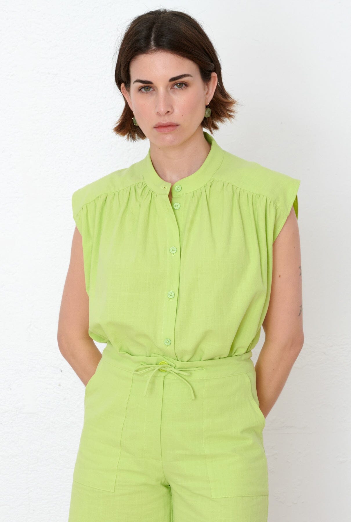 Sleeveless shirt with wide flat collar. Central opening with 7 buttons. Loose and fresh design, ideal for the summer months