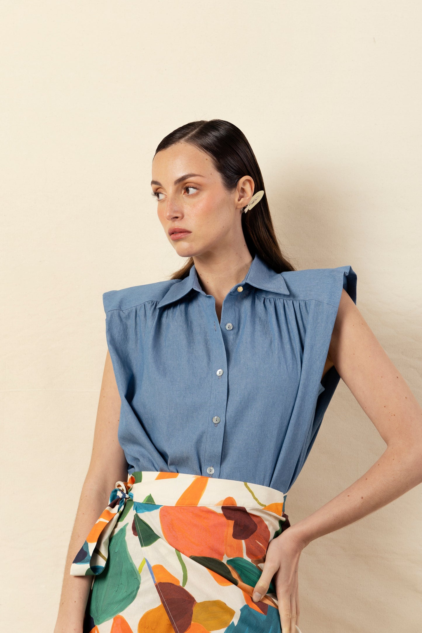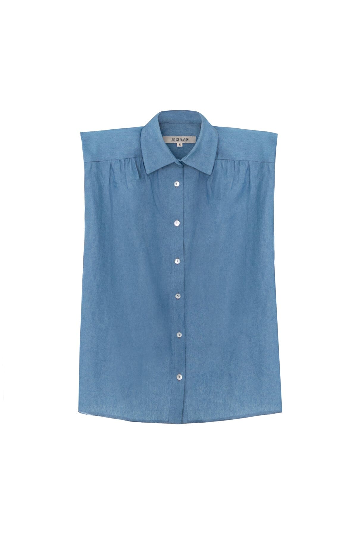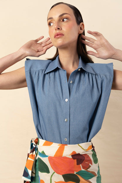 Our iconic Marieta shirt in a very light blue denim fabric and sleeveless. With mother-of-pearl buttons on the front and golden buttons on the collar. Ruffle detail on the shoulder and lined shoulder pads. For a complete look it can be combined with an infinite number of bottoms, it is a very versatile closet shirt.