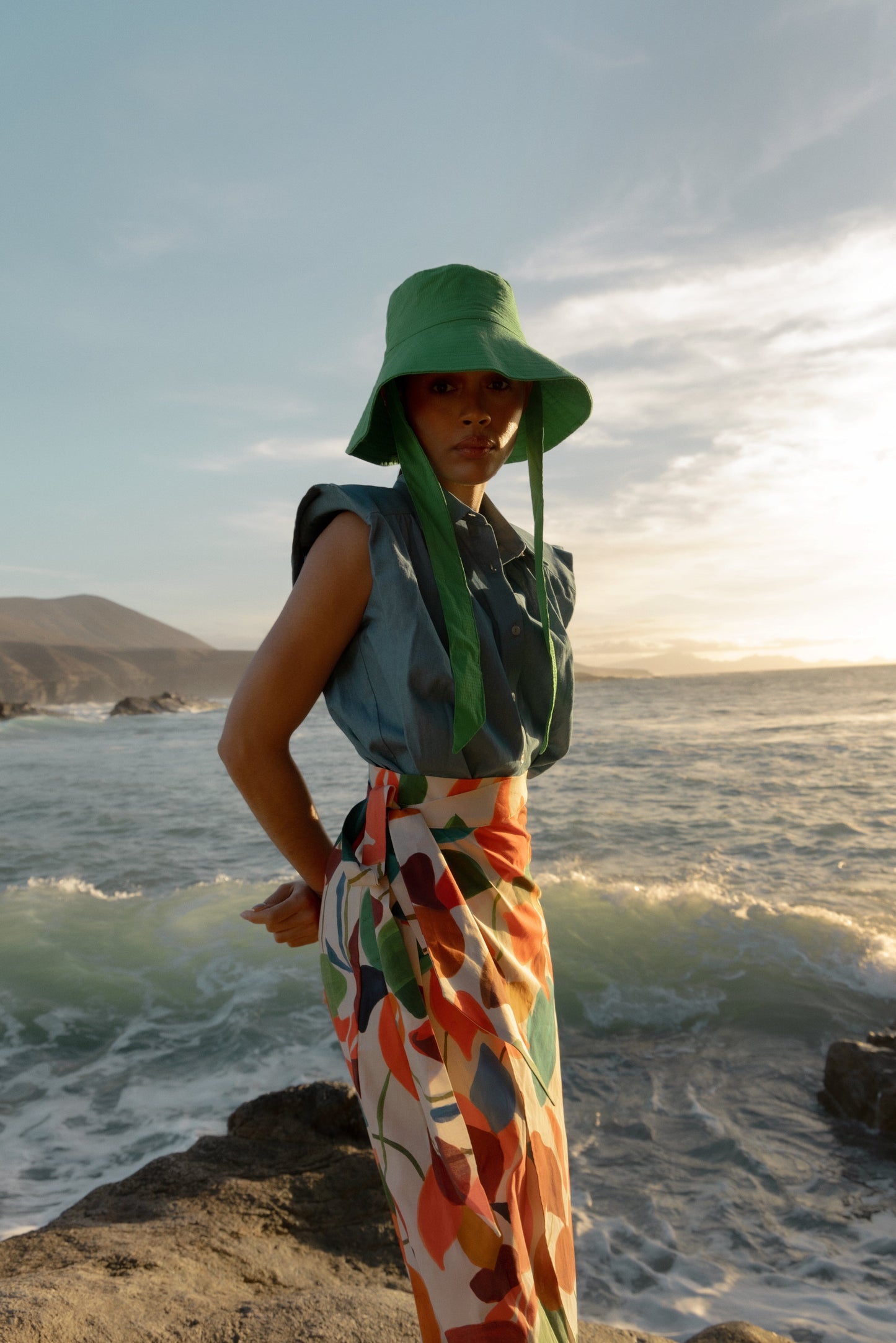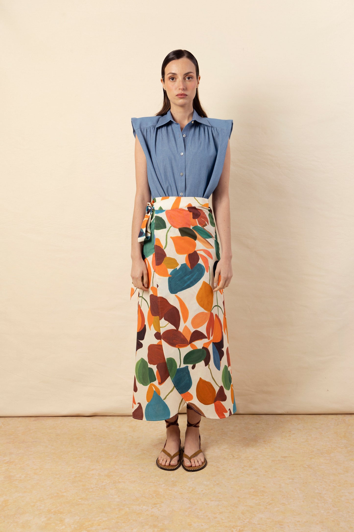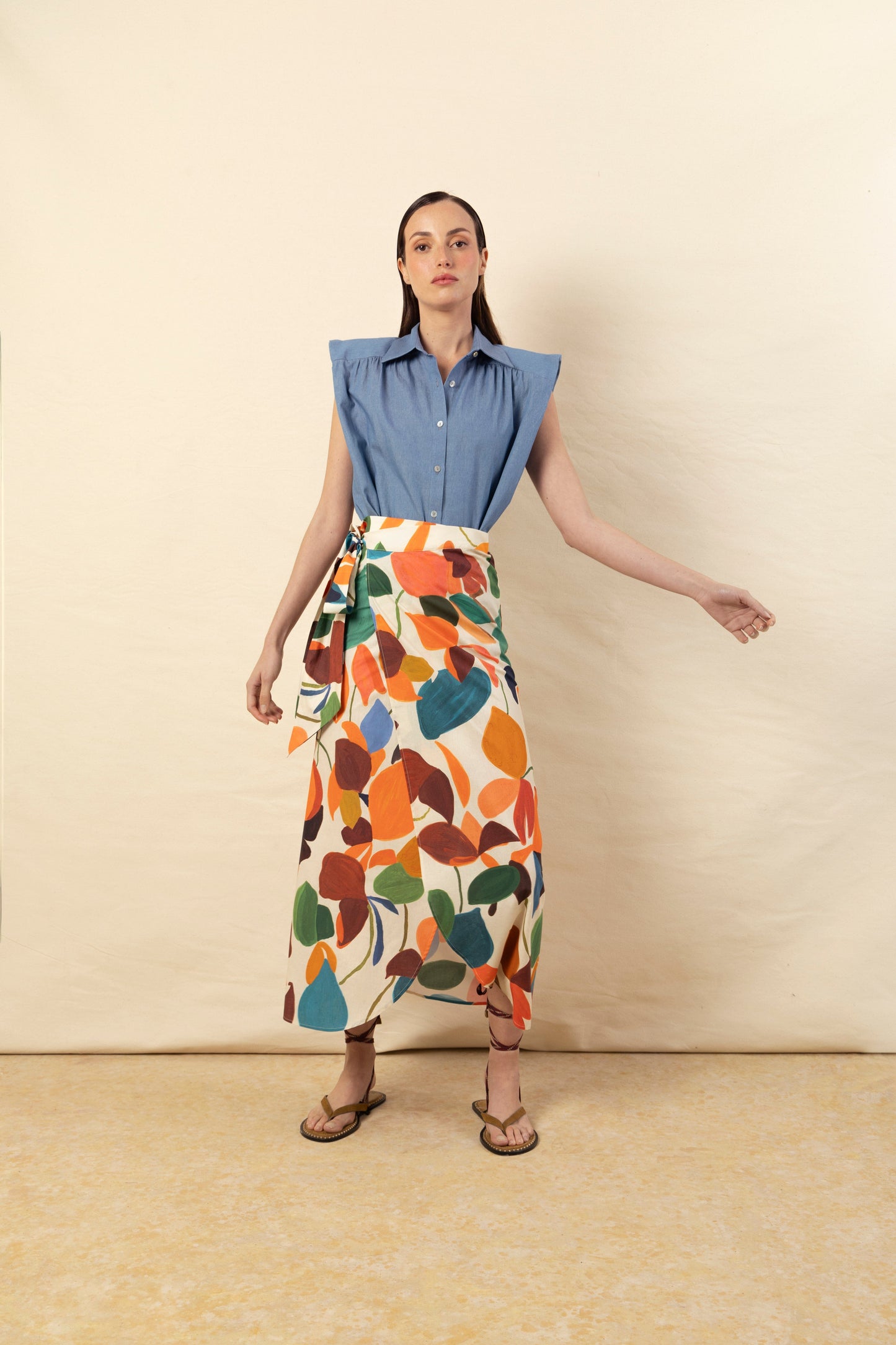 Our iconic Marieta shirt in a very light blue denim fabric and sleeveless. With mother-of-pearl buttons on the front and golden buttons on the collar. Ruffle detail on the shoulder and lined shoulder pads. For a complete look it can be combined with an infinite number of bottoms, it is a very versatile closet shirt.
