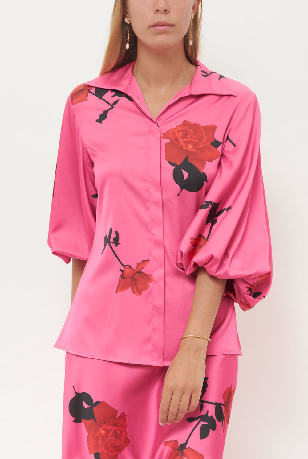 Slim fit shirt with large volume sleeves and covered plaquet, printed with red roses on a fuchsia background. Juan Vidal's collection exclusive for Es Fascinante.