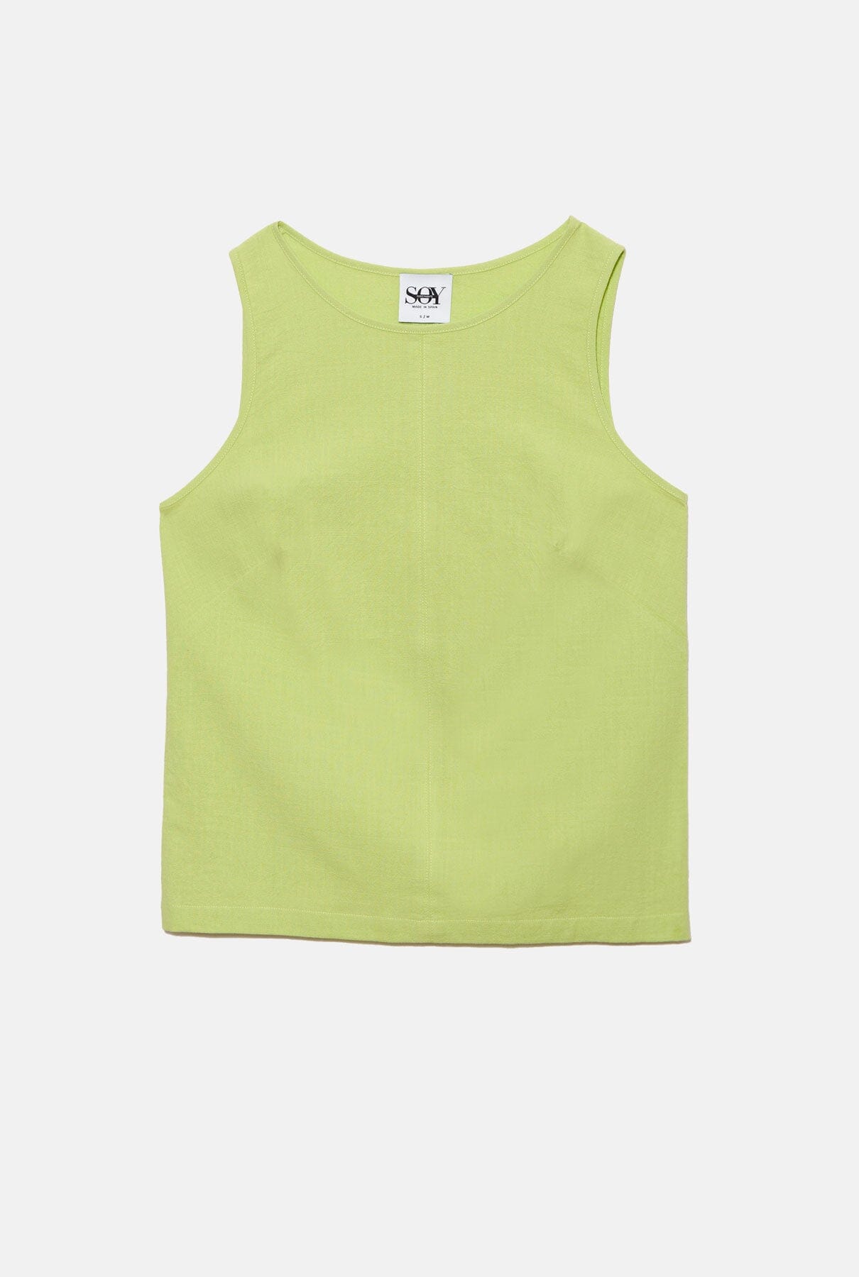 Cotton fabric T-shirt. Straight cut, collarless and sleeveless.