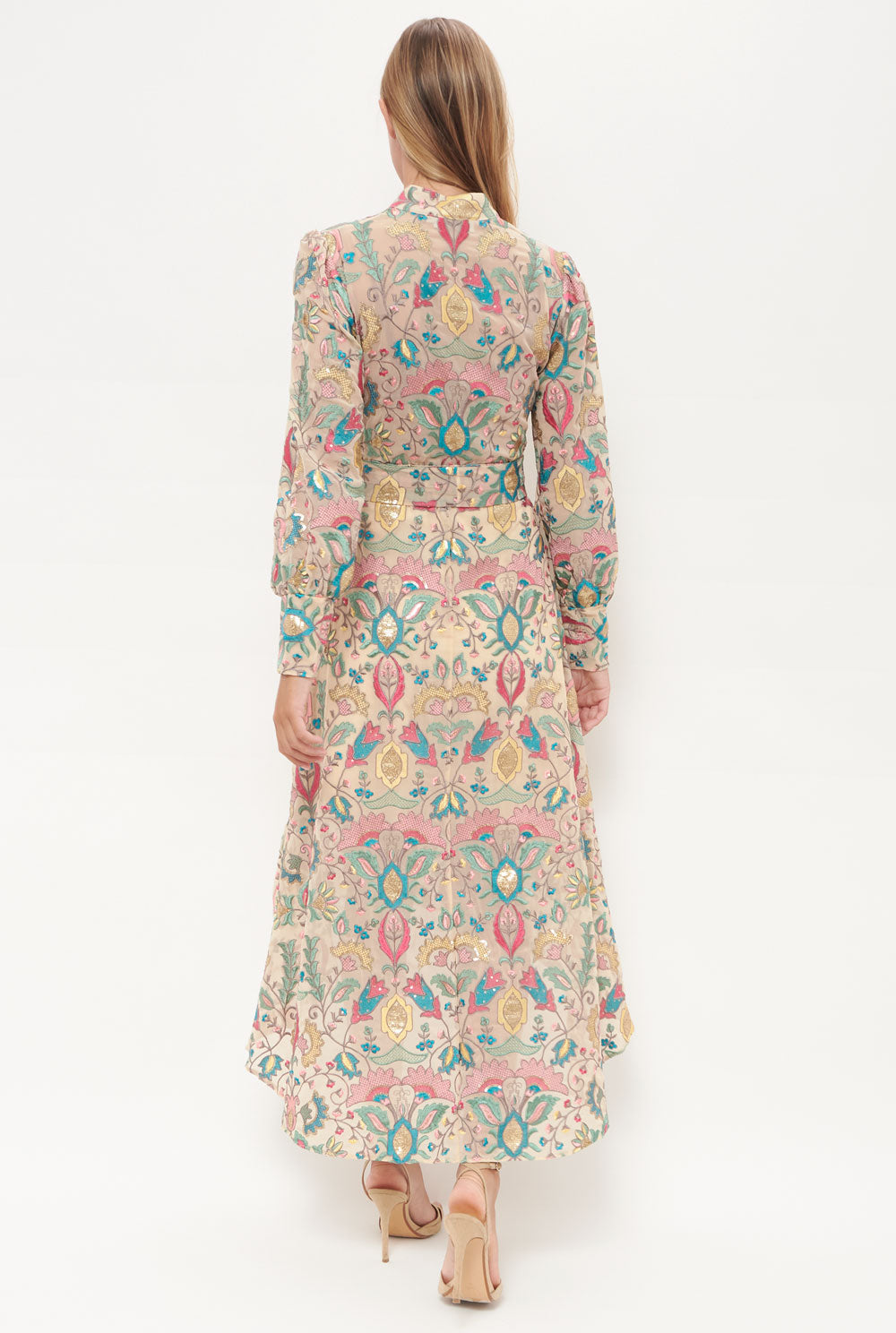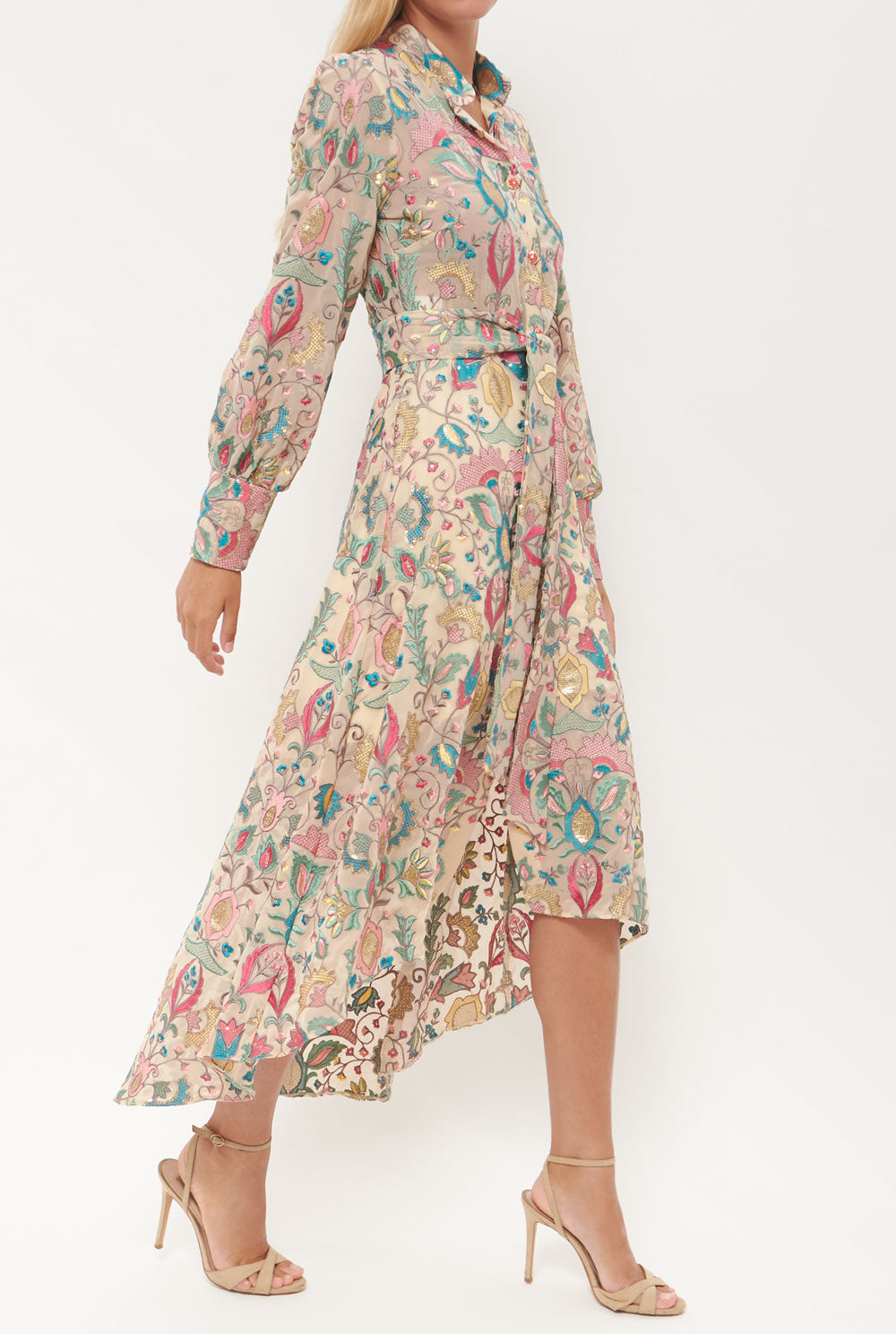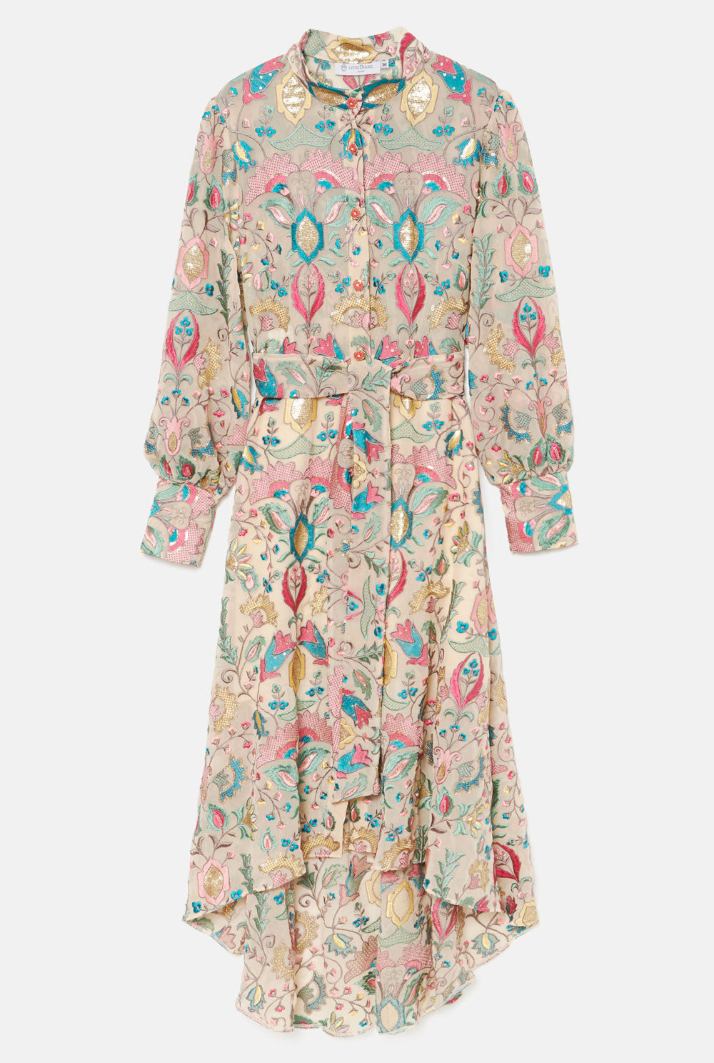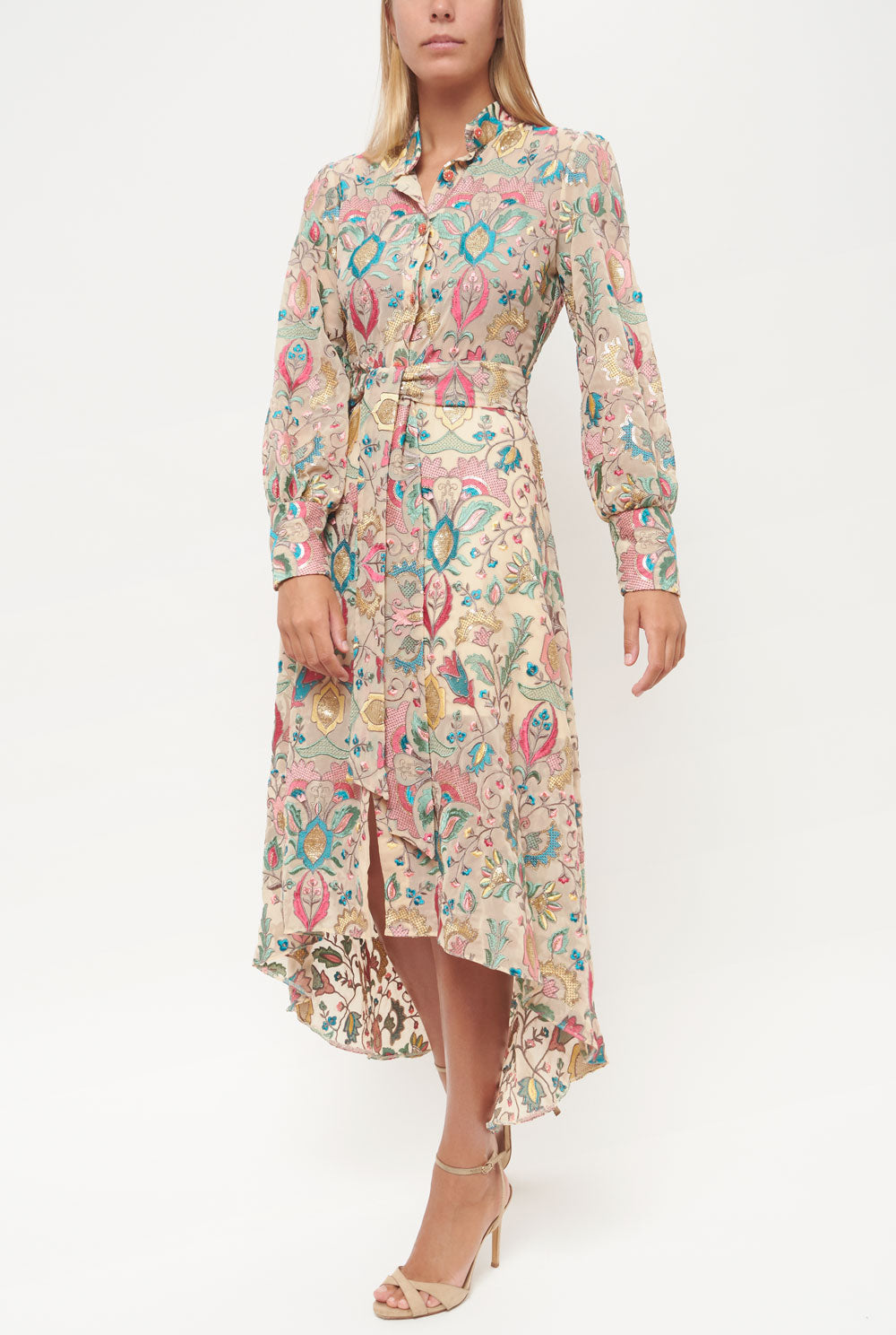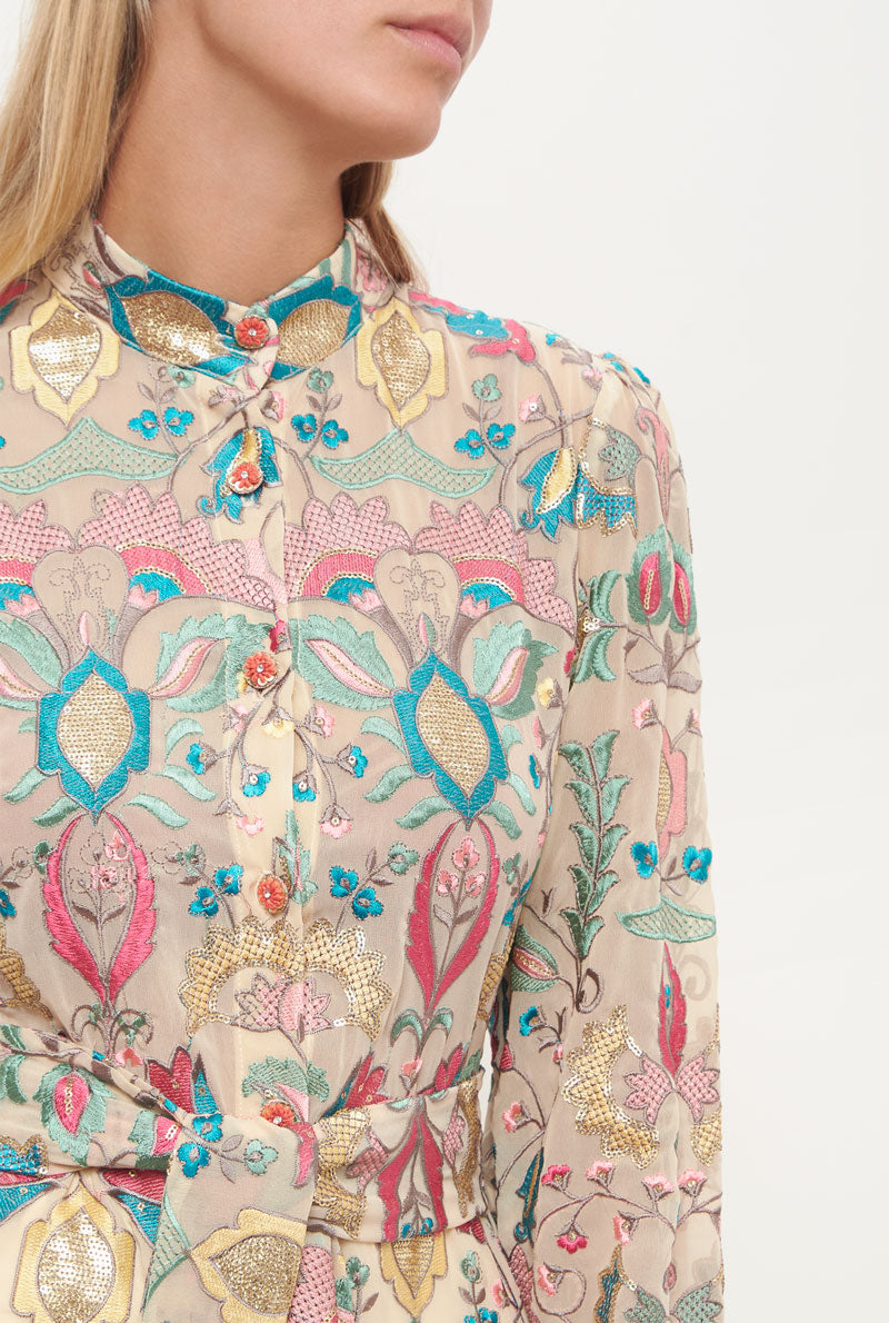 Collared dress mao with long cuffed sleeves. flower embroidery with front closure with jewel buttons. Linning. Designed by Leyre Doueil.