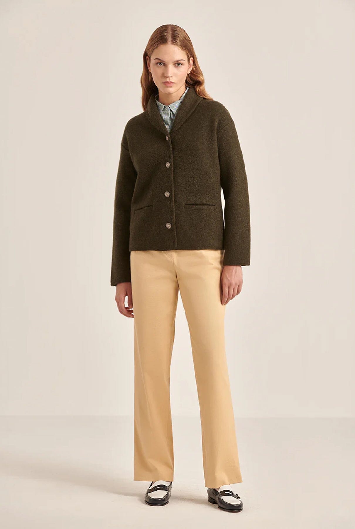 Austrian jacket in green boiled wool, dinner jacket collar and metal button fastenings.