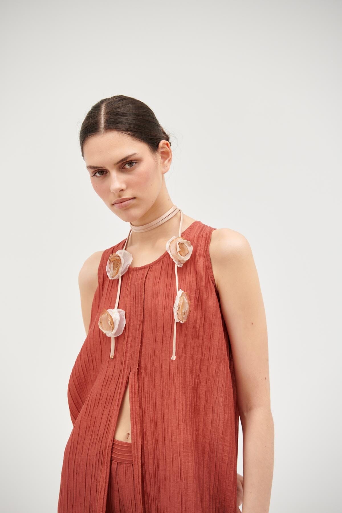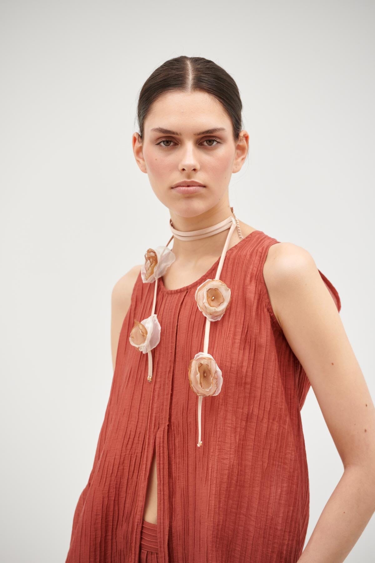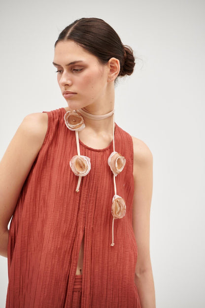 Handmade satin necklace with organza flowers and matching rhinestone detailing.