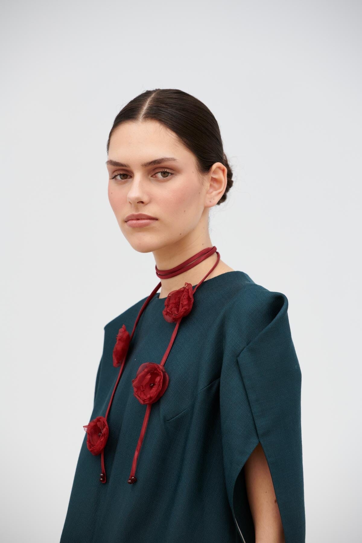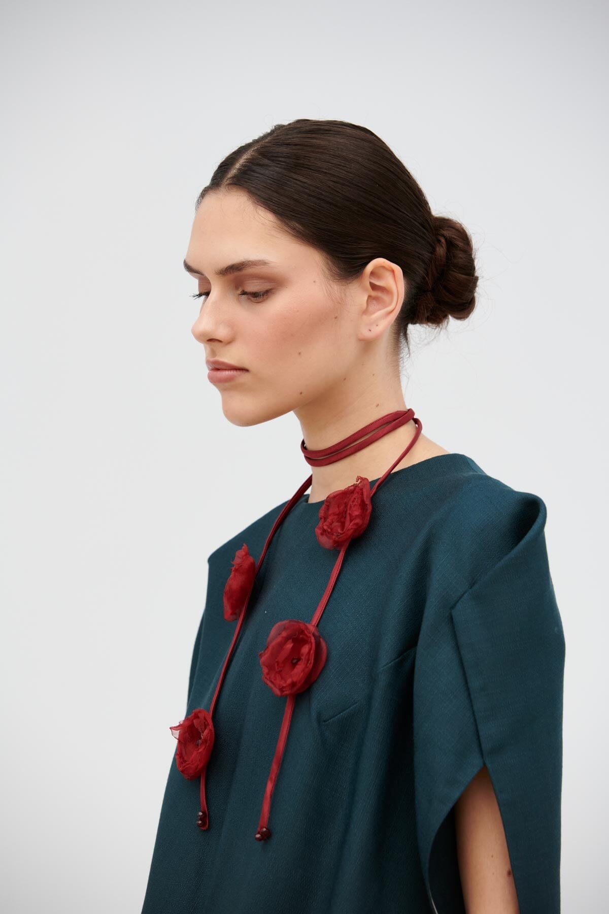Handmade satin necklace with organza flowers and matching rhinestone detailing.