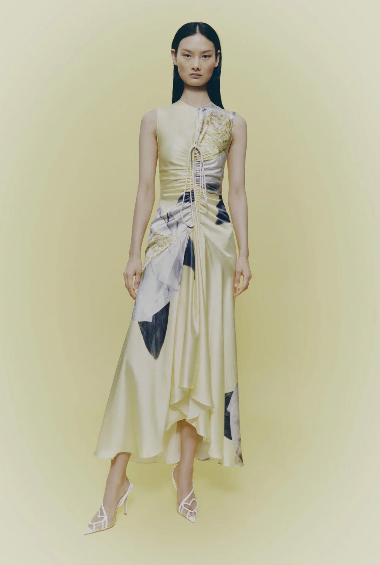 Slip dress type, with adjustable thin straps, printed with floral motif of peony. the dress is made inside out, making the darts and the neckline visible, which in turn is elongated decorating the front of the garment.