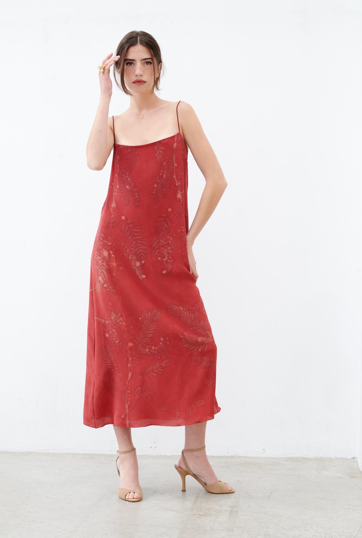 The botanical printing or ecoprint consists of transferring the natural pigments of plants to textiles by contact and heat. Due to the very artisanal techniques, every dress is different and uique. The process and results may vary during diferent seasons because of the changes in nature.