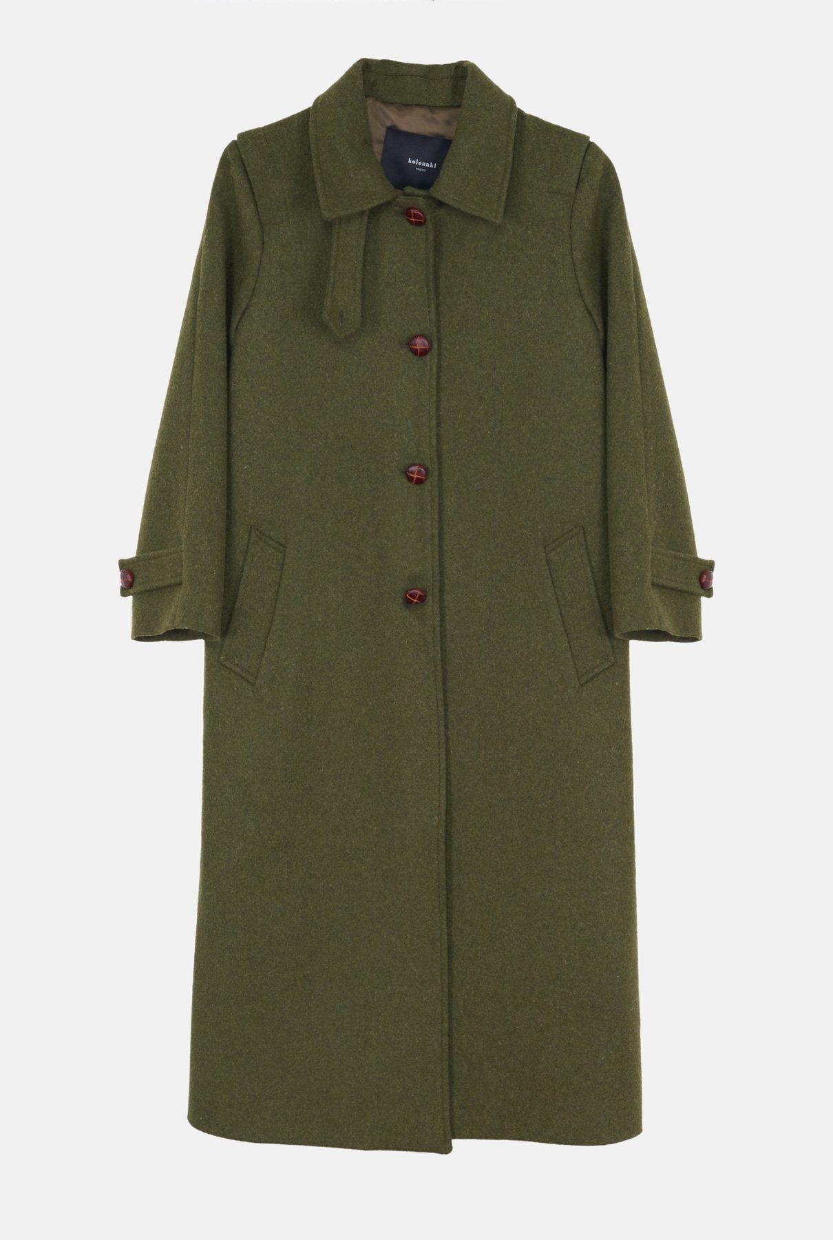 Long loden coat in green cloth with viscose lining. The Landan hood and Lilibet overcoat can be attached. Both garments are sold separately.