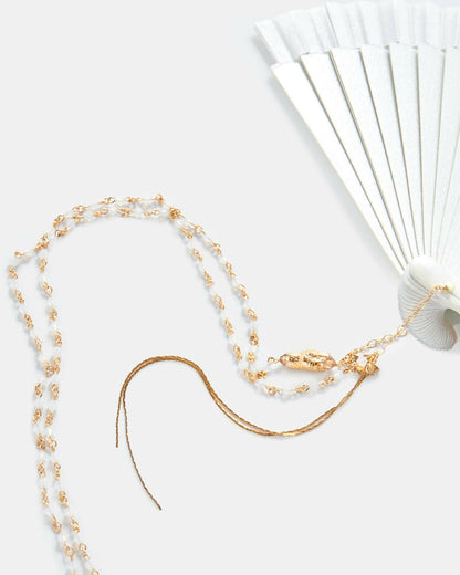 Hand made in Spain white lacquered wooden fan (15cm), golden brass chain with white mate Swarovski crystals, and snake head charm.