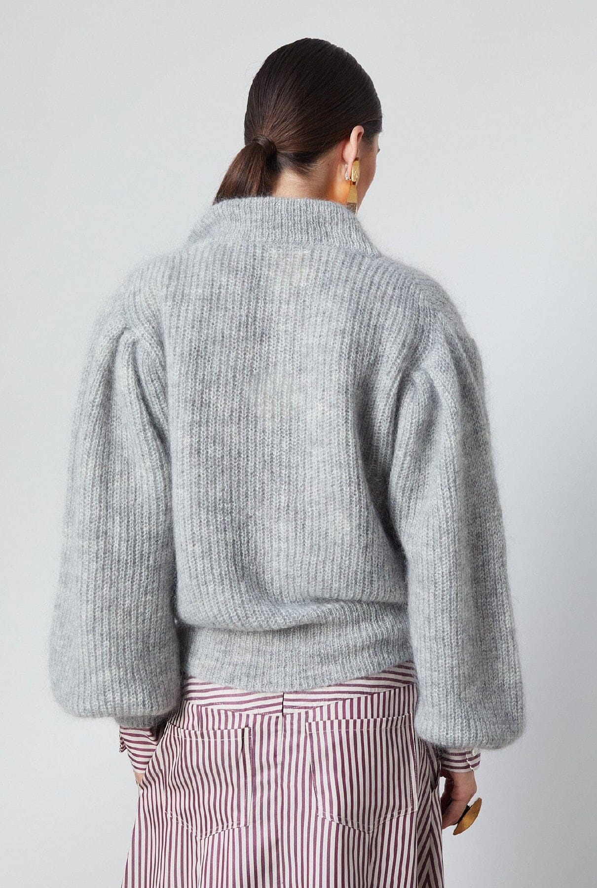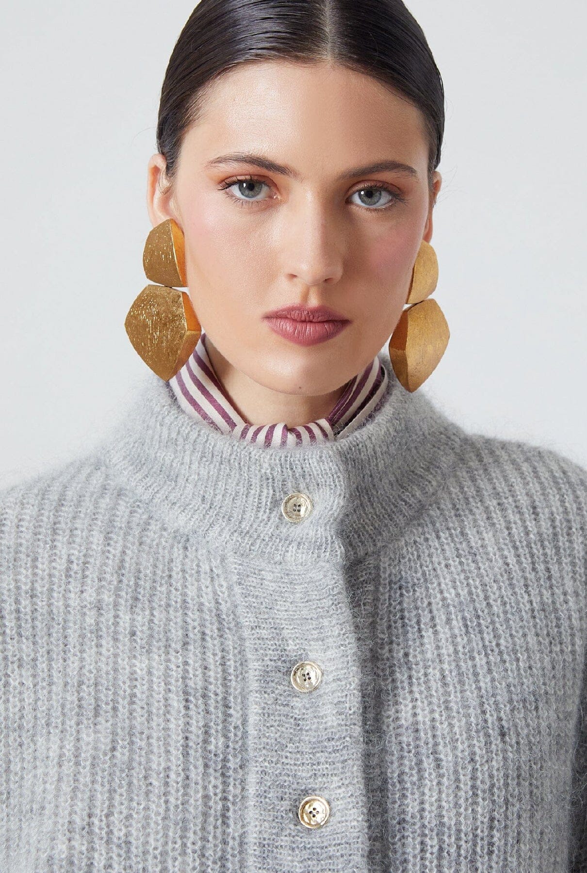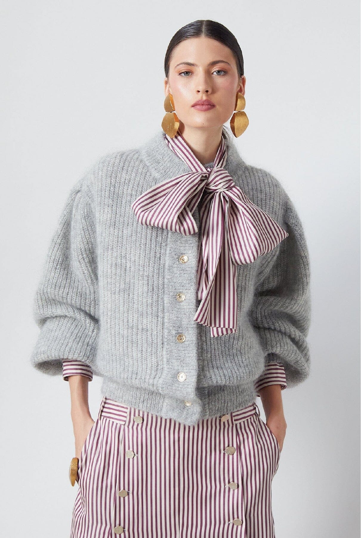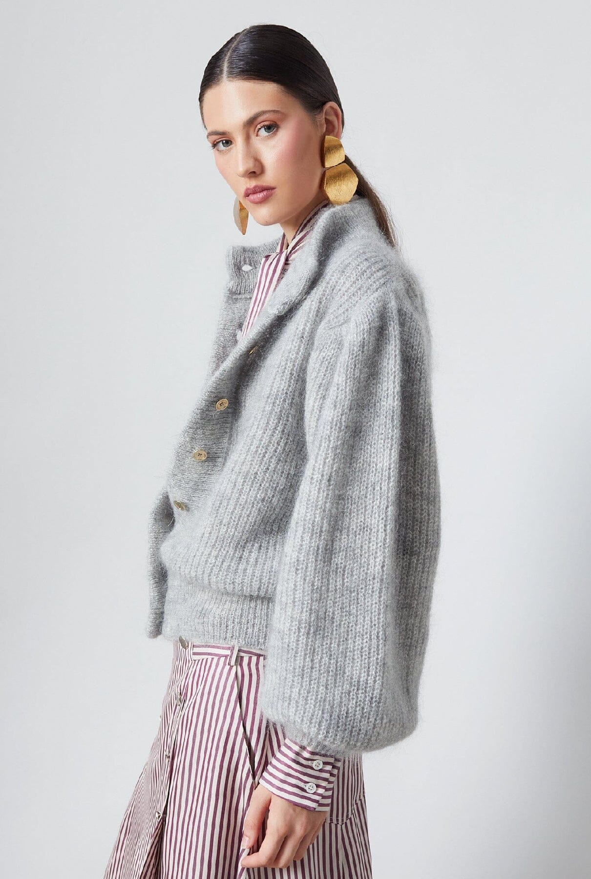 An essential knitwear piece for your wardrobe this season. Featuring long puffed sleeves and a striking set of golden buttons, this grey cardigan will keep you cozy and warm all season long.