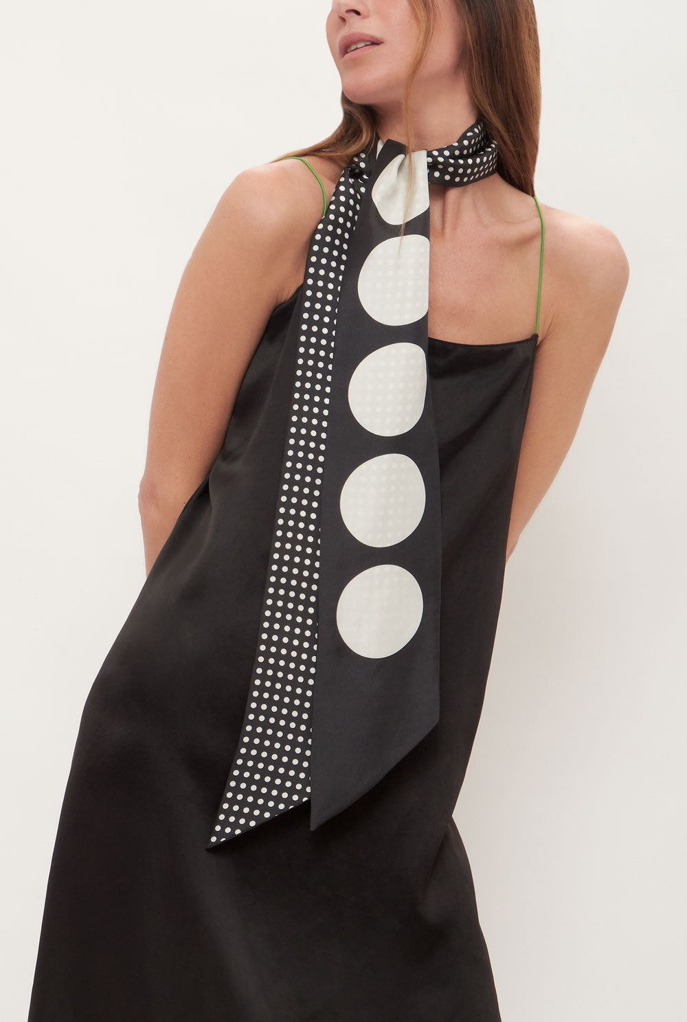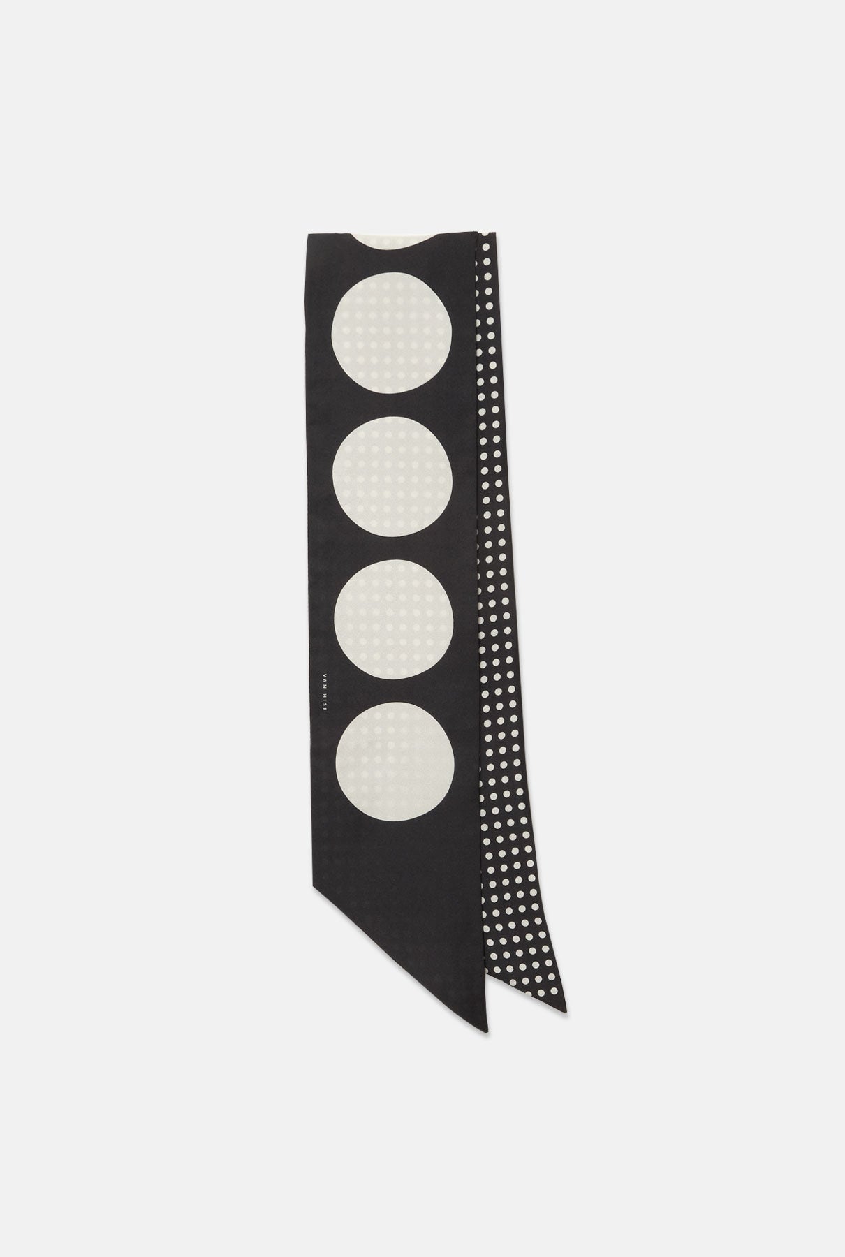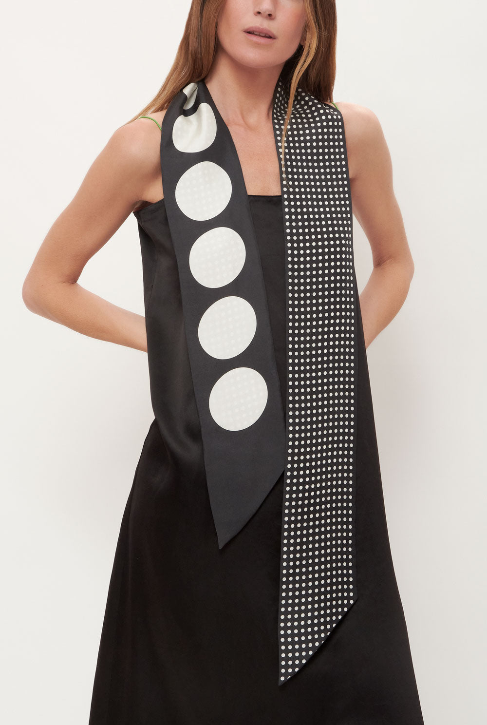 Limited Edition designed by Carrie Van Hise. Long double silk scarf printed with two different polka dot patterns inspired in Spanish folklore and the classic flamenco print. The Lola scarf can be worn around the neck, as a head scarf, or to belt a dress or jeans for a casual look. Made in Spain