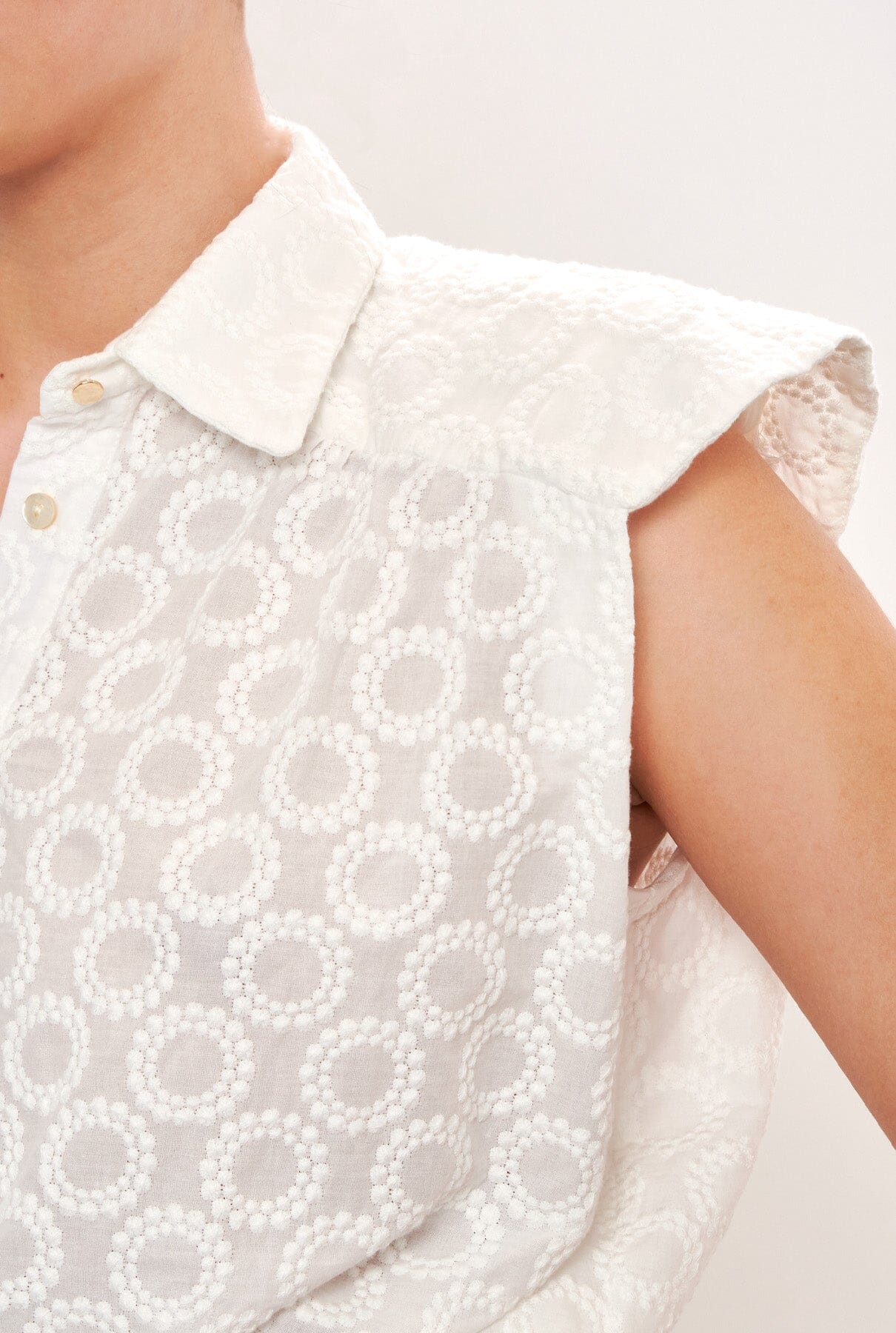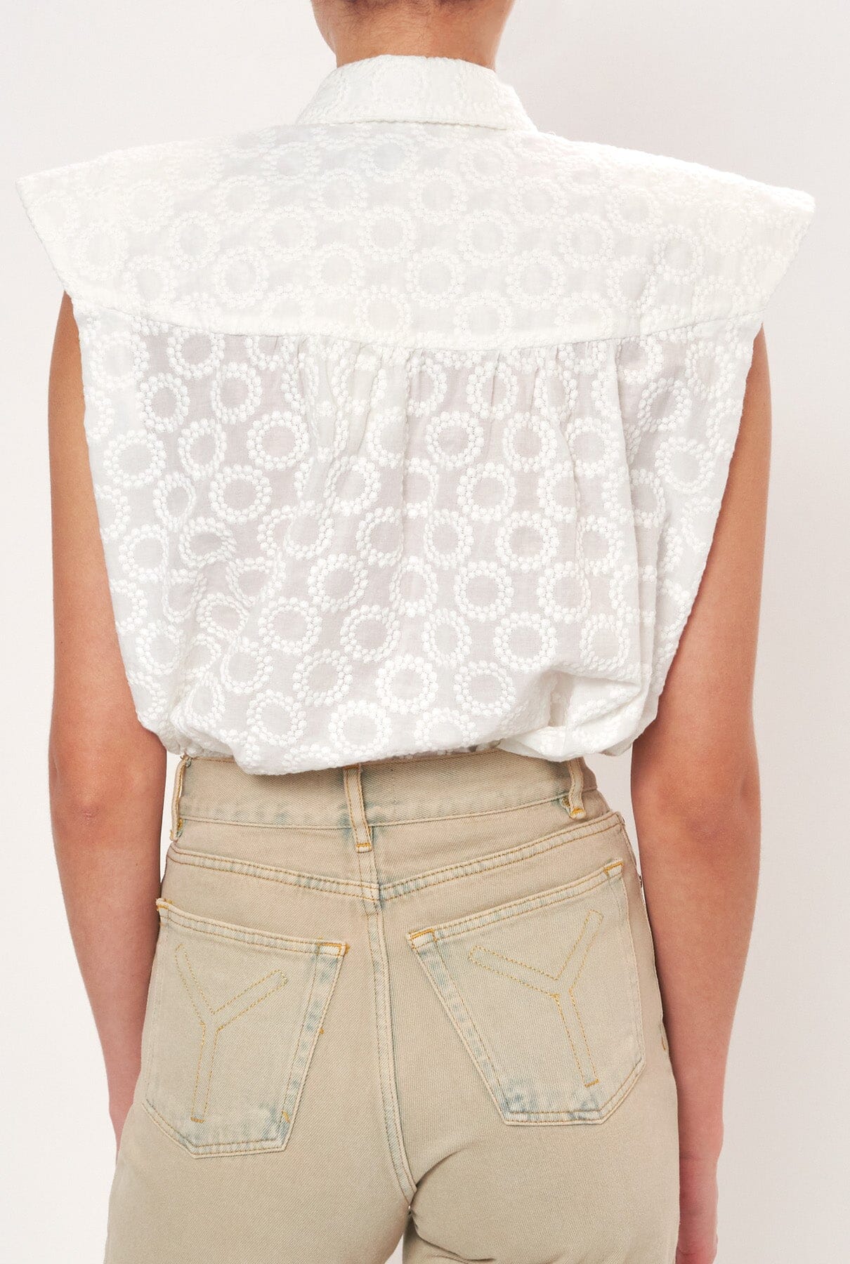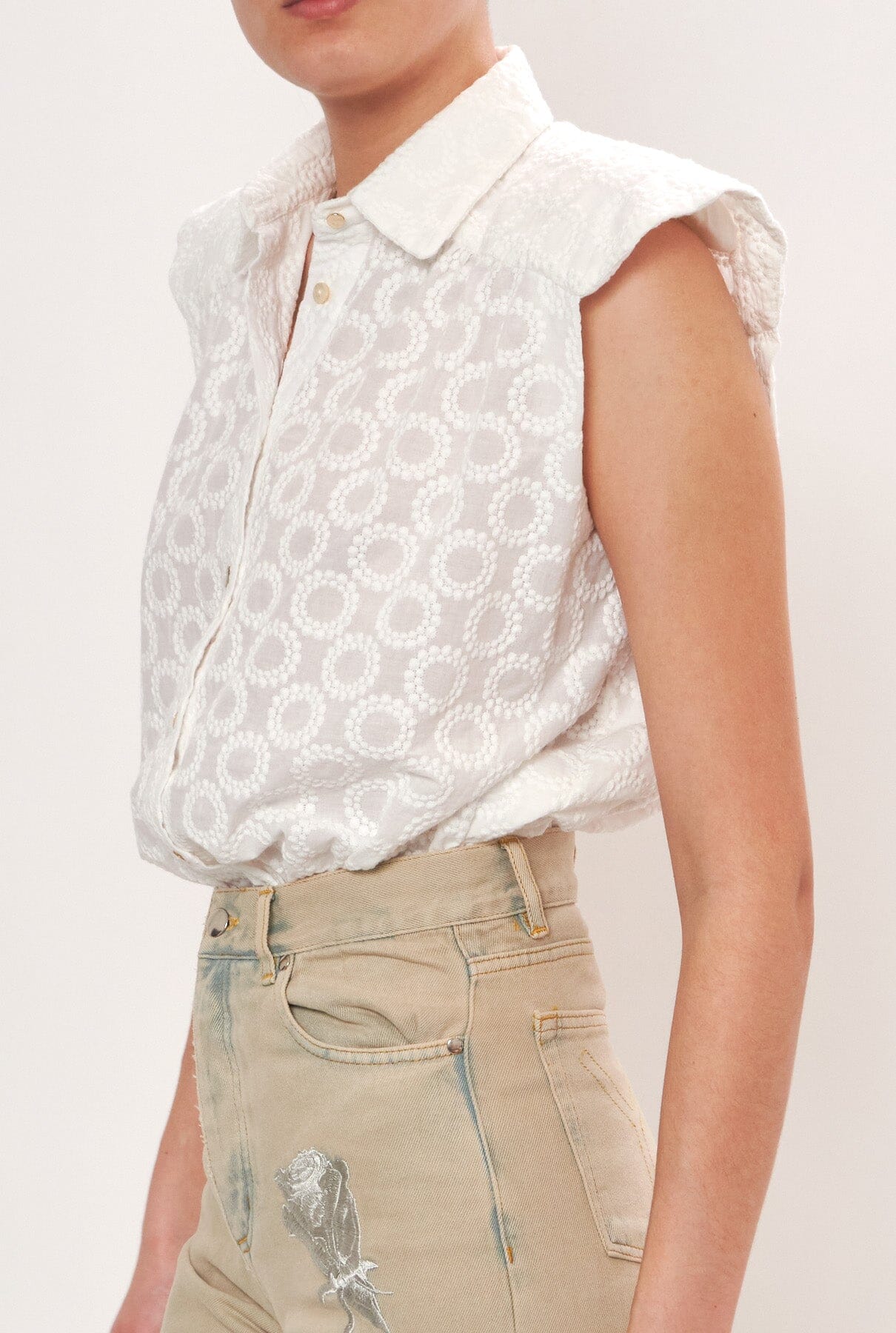 Sleeveless version of our Miru shirt in embroidered white cotton fabric. With mother-of-pearl buttons on the front and golden buttons on the collar. With shoulder pads. For a complete look it can be combined with an infinite number of bottoms, it is a very versatile wardrobe shirt.